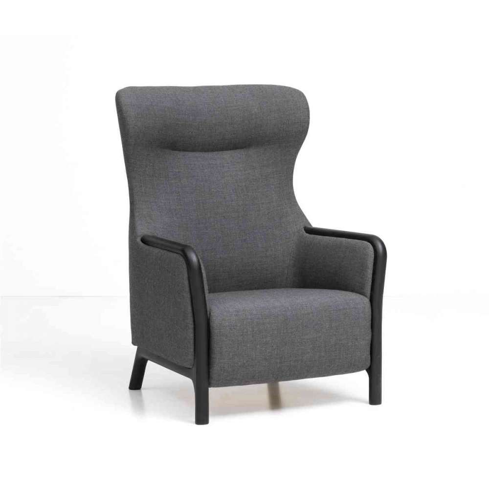 Fotel z wysokim oparciem, bocznym zagłówkiem i wyprofilowaną wyściółką dla maksymalnego komfortu. Podłokietniki z profilem z drewna jesionowego. Naturalne drewno jesionowe.