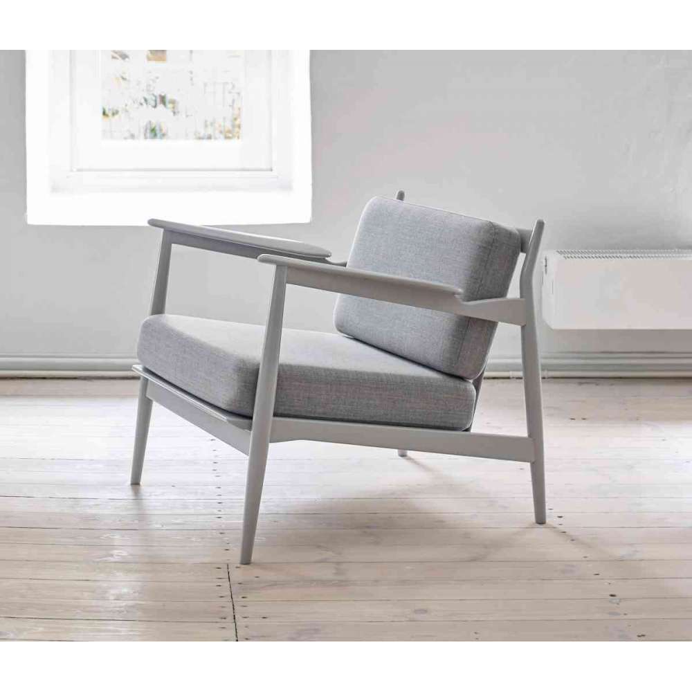 Model 107 został zaprojektowany w latach 50. XX wieku i pierwotnie wyprodukowany przez Magnusa Olesena w 1956 r. Detale krzesła odzwierciedlają słynny, klasyczny design tamtej epoki – Danish Modern. Krzesło reprezentuje podejście Ib Kofod-Larsen w najlepszym wydaniu: zaprojektowanie nieco masywnego, wygodnego fotela, a jednocześnie dodając mu elegancji i lekkości.