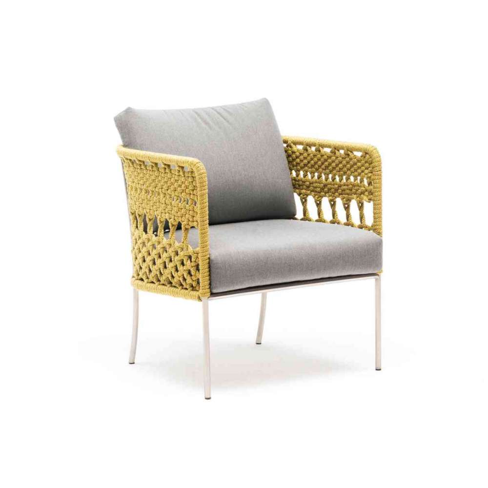 Poduszki siedziska i oparcia z pianki poliuretanowej o otwartych komórkach i pokryte włóknem akrylowym do użytku na zewnątrz. , nadające się do recyklingu, ekologiczne tuby, nadające się zarówno do wnętrz, jak i na zewnątrz, w kolorach z kolekcji. Ta koronka, zainspirowana starożytną techniką szydełkowania Cantù, przywraca tradycyjne ściegi zwane półściegami i lnianymi ściegami z połączonymi skrętami, odnowione we współczesny sposób, aby stworzyć nowe wzory i wzory dzięki wyjątkowo dużej szpulce i zdecydowanie grubszym niciom.