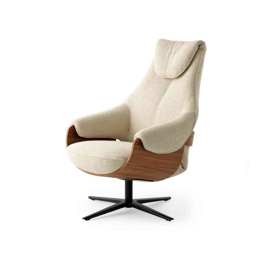 Studio Truly Truly łączy naturalne materiały w krześle obrotowym Leolux LX, LXR10, tworząc elegancki fotel o wysokim komforcie. Nacisk kładziony jest na drewnianą skorupę ze sklejki w kolorze orzecha włoskiego lub dębu, tapicerowaną tkaniną lub skórą. Aluminiowa podstawa obrotowa oferuje również opcje dostosowywania. Można to wykończyć polerowanym aluminium lub kolorem epoksydowym, aby uzyskać doskonały rezultat.