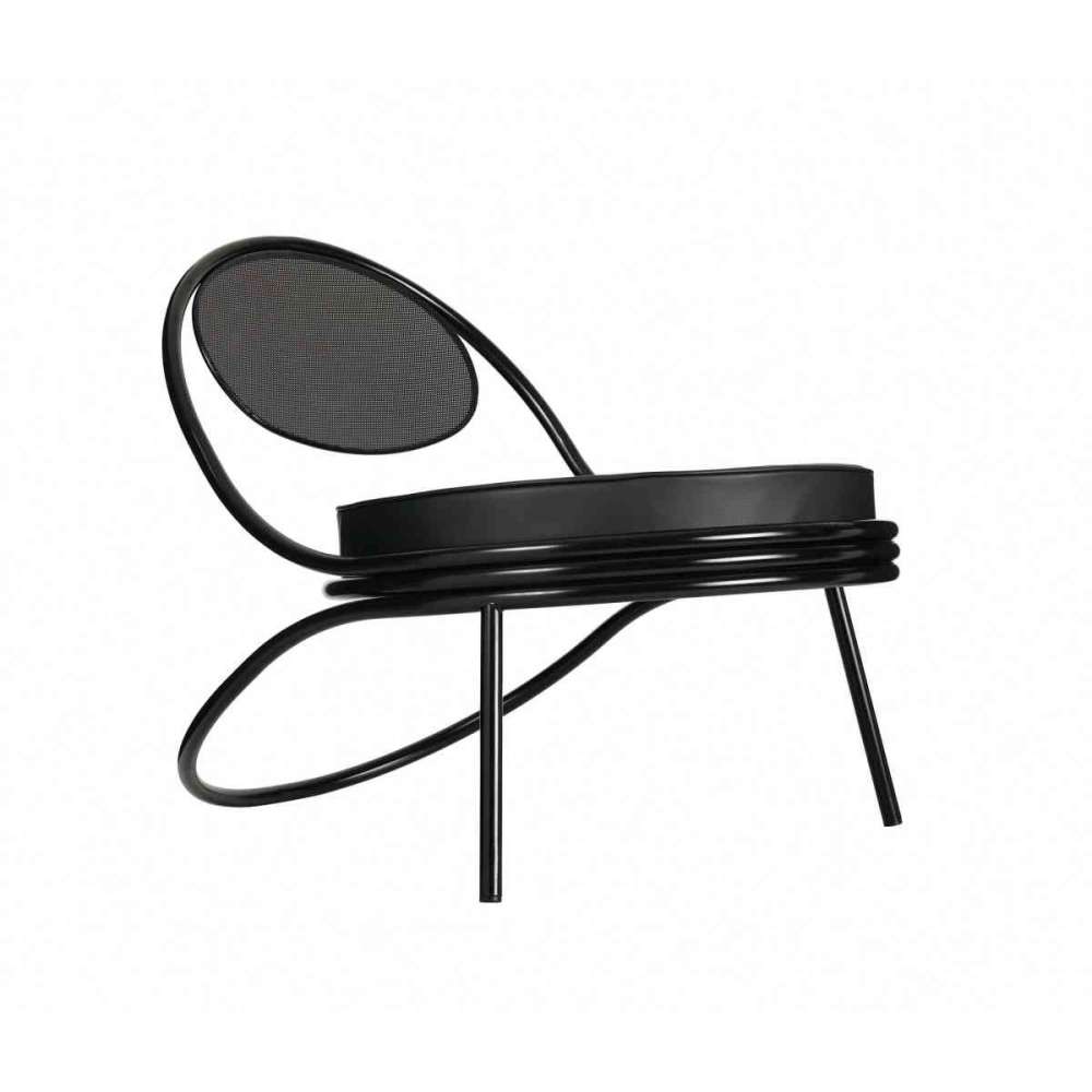Tył wykonany z blachy perforowanej. Luźna poduszka wykonana jest z tkaniny lub skóry z dopasowanymi guzikami i lamówką