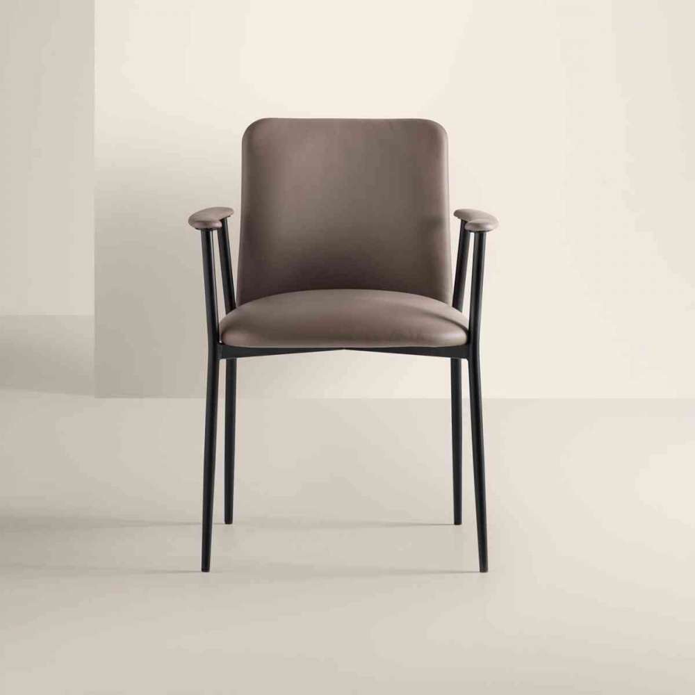 Kolekcja krzeseł ze stalową ramą, siedziskiem i oparciem ze sklejki wyściełanej skórą lub tkaniną. Dostępne z podłokietnikami i bez podłokietników wys. 80, wys.1 46, szer. 56, gł. 55