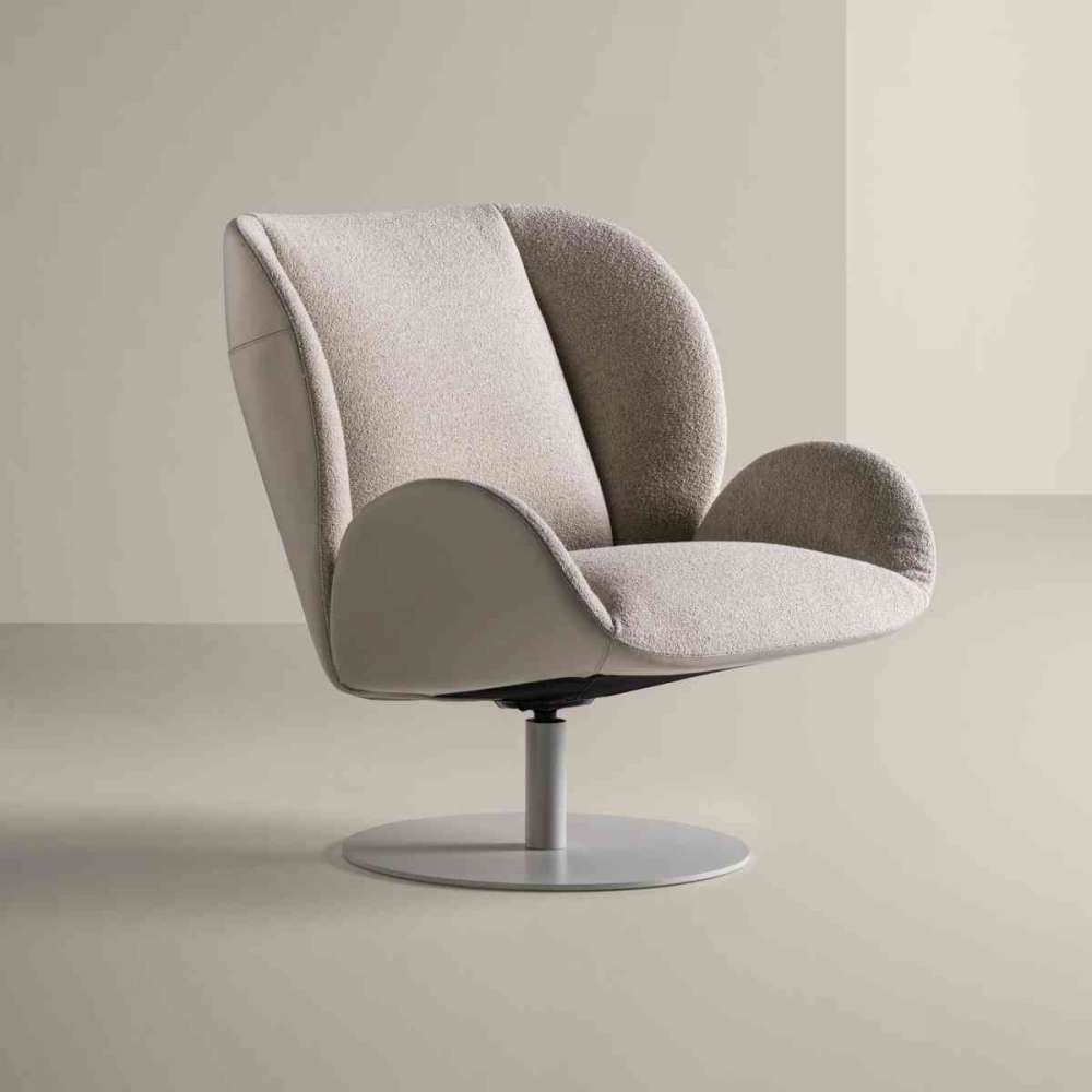 Fotel wypoczynkowy z wyściełaną strukturą ze sklejki tapicerowanej skórą lub tkaniną. Stalowa podstawa obrotowa z mechanizmem powrotnym z wykończeniem w kolorze ciemnego brązu lub malowana na zamówienie w dowolnym kolorze z palety RAL. wys.cał. 90,5, wys. 1 46, wys. 2 58, szer. 89, gł. 90