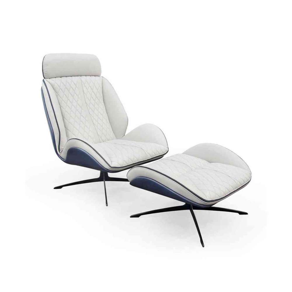 Fotel: Siedzisko i oparcie ze skóry Daino kol. Oyster, outback w skórze Daino kol. Midnight, wnętrze ze skóry Daino kol. Oyster/ Daino kol. perforacja ostrygowa ze szwem w tonacji kolorystycznej, lamówka ze skóry Daino kol. północ, nadrukowane logo TL na zewnątrz zagłówka i podpis TL na zewnętrznym zagłówku, metalowa podstawa lakierowana kol. czarny mat.