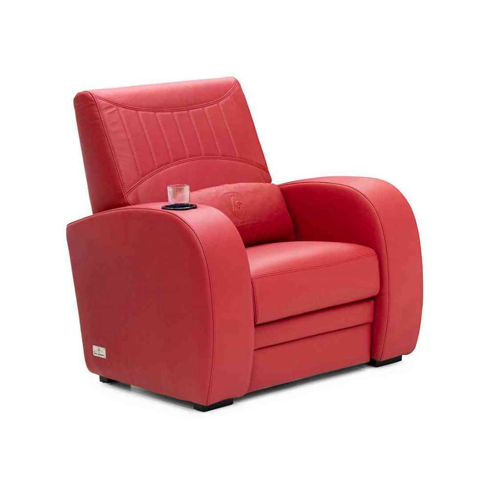 Fotel relaksacyjny z elektrycznym rozkładanym fotelem, uchwytem na kubek z urządzeniem chłodzącym i oświetleniem serwisowym oraz systemem masażu. Tapicerowane skórą Sport kol. 415. Logo TL Bull nadrukowane na oparciu.