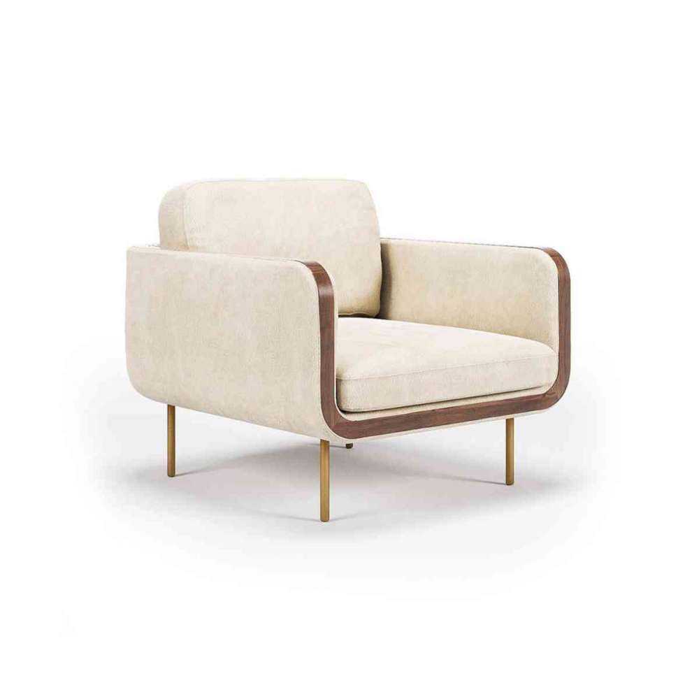 Całość w skórze Daino kol. Mleko, wstawki w okleinie Noce Canaletto, metalowe nogi w kolorze Goldchamp S. mat.