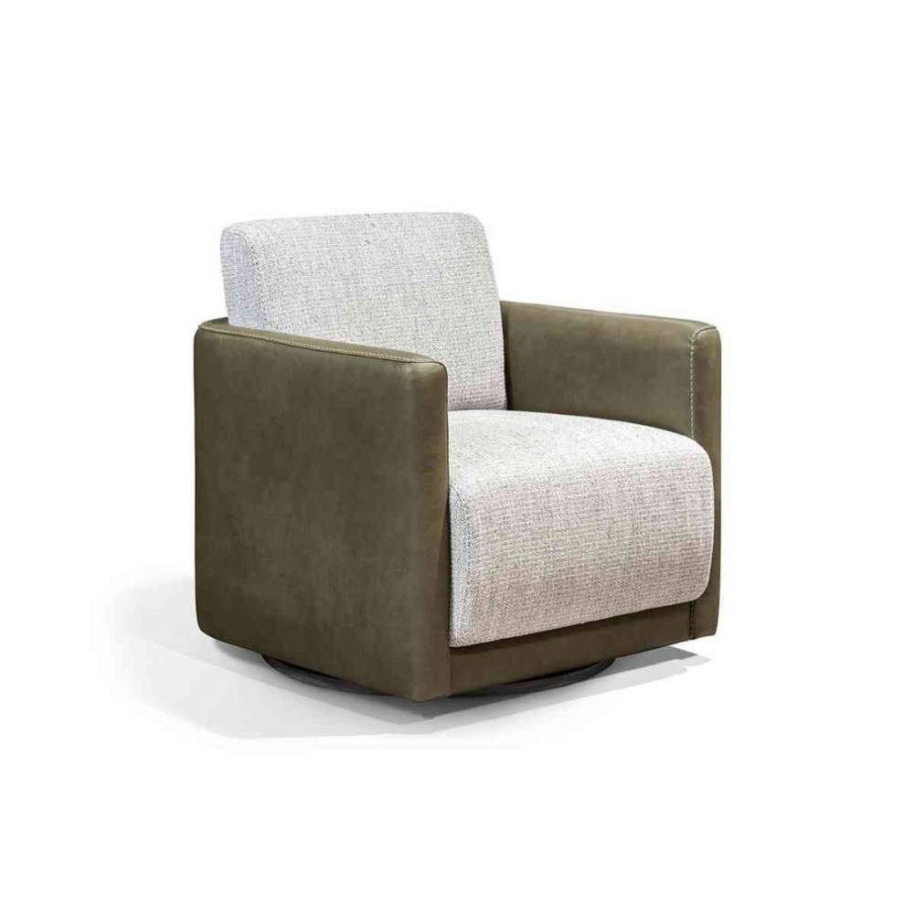 Skórzany kot. NewSkin kol. 1610 zielony, poduszka siedziska i oparcia z tkaniny Nat col .801, obrotowa podstawa w okleinie Dąb szary nieprzezroczysty. Zdejmowany zagłówek manualny w tkaninie Nat kol.801.