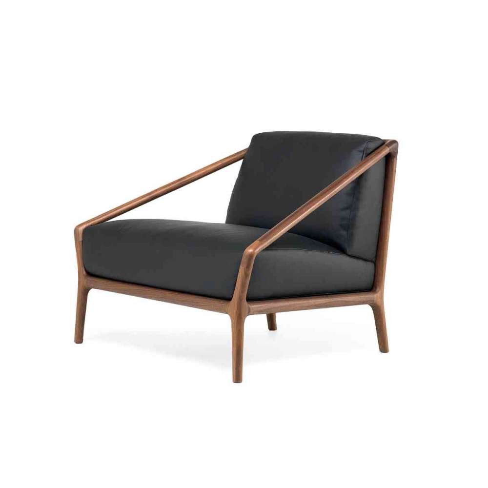 Fotel o konstrukcji wykonanej z litego orzecha amerykańskiego. Poduszka siedziska z ramą ze sklejki pokrytej pianką poliuretanową o różnej gęstości. Poduszka oparcia z wypełnieniem puchowym.