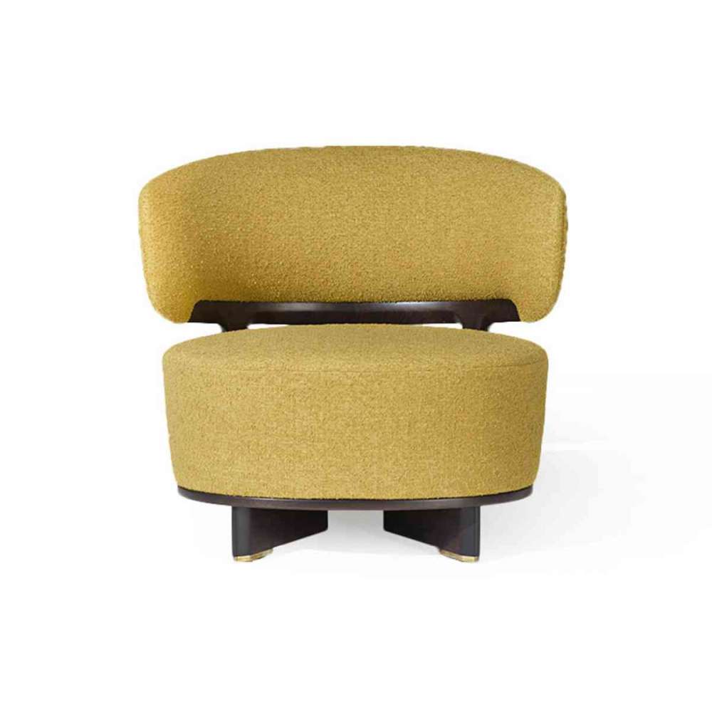 Fotel wykonany z litego orzecha amerykańskiego. Siedzisko i oparcie z tapicerowanej sklejki topolowej. Końcówki nóg z mosiądzu.