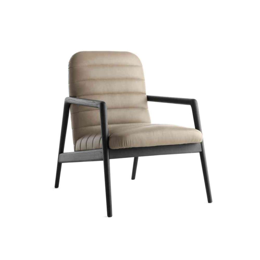 Fotel z solidną jesionową ramą. Wewnętrzny korpus ze sklejki, wyściełany pianką zapamiętującą kształt i pokryty tkaniną, sztuczną skórą lub skórą.