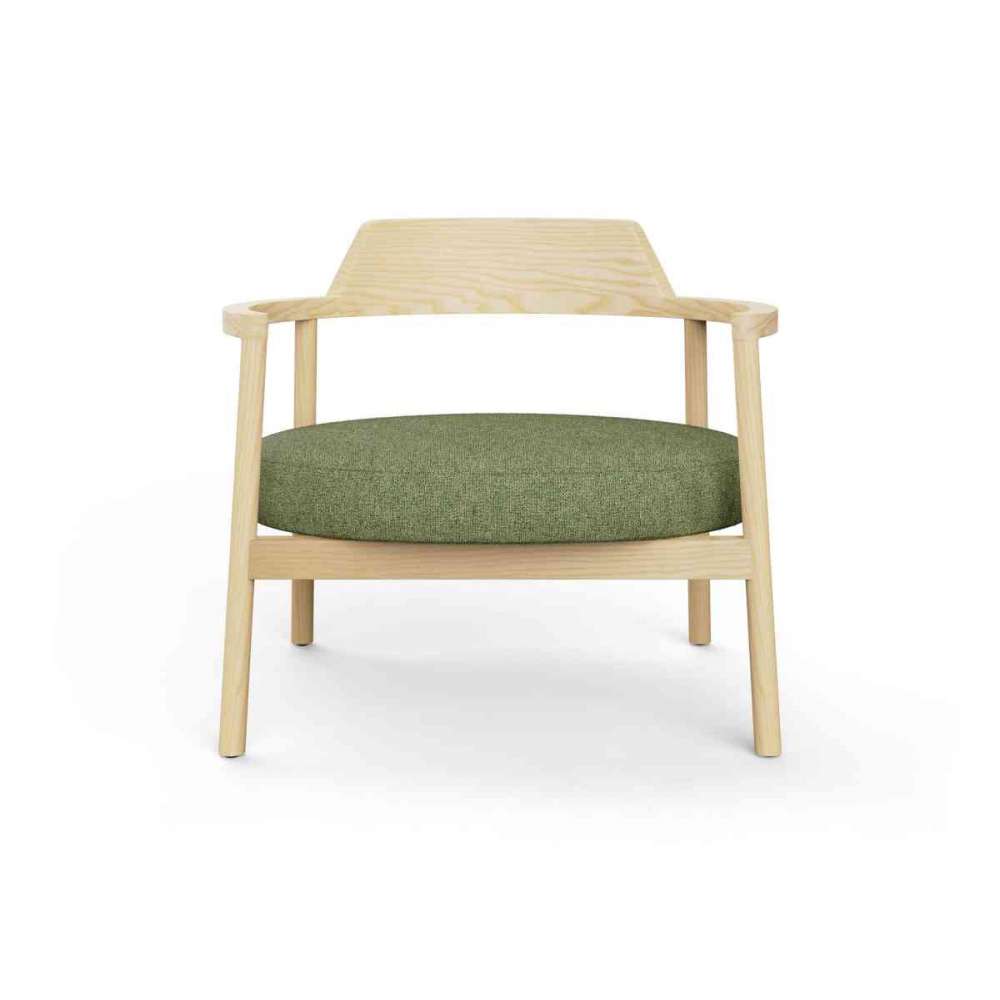Alek zaprasza do komfortowego siedzenia. Jego podłokietniki i oparcie są zaprojektowane jako jedna konstrukcja. Cylindryczne drewniane nogi rozciągają się ukośnie od poziomu podłokietników do podłoża, tworząc estetyczny kontrast z owalnym wyprofilowanym oparciem. Ciepło drewna dominuje w efekcie wizualnym, ponieważ łączy się z gładkim siedziskiem. Siedzisko z miękkiej pianki o grubości 70 mm oraz świeży wygląd drewna potęgują poczucie komfortu.