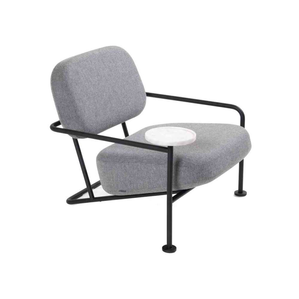 Rama z drewna. Tapicerowane w formowanej piance poliuretanowej CMHR, w tkaninie. Podwozie ze stali lakierowanej na czarno. Plastikowe nóżki. Blat z olejowanego dębu lub marmuru Carrera.