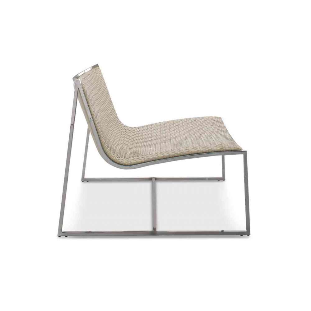 Uniwersalne passe-partout krzesło wypoczynkowe Samoa wyróżnia się falistymi liniami siedziska i oparcia, tutaj w wersji z plecionymi siedziskami kontrastującymi z ostro kwadratową podstawą. Siedzisko i oparcie są wykonane z pianki poliuretanowej pokrytej skórą, skórą syntetyczną lub skórą kucyka, a rama jest dostępna w wersji malowanej lub chromowanej z rur stalowych.