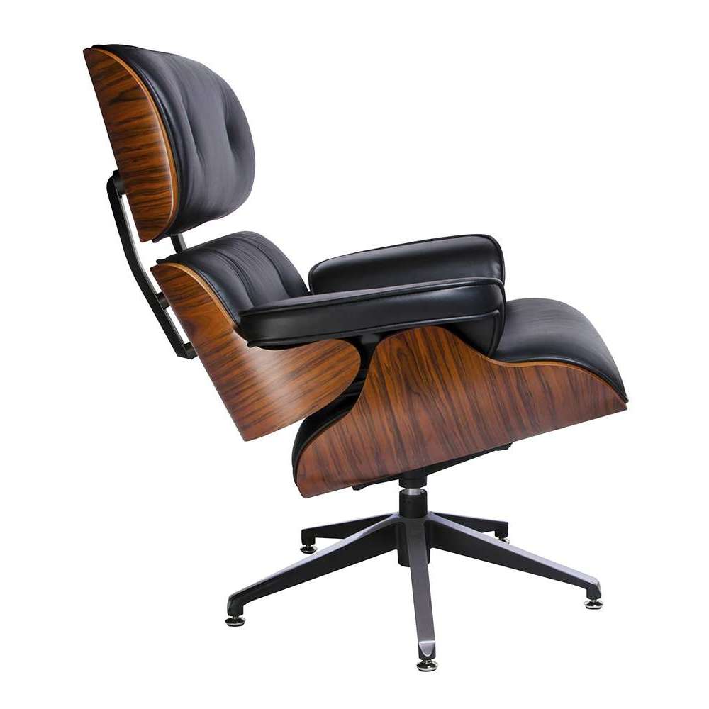 Fotel LOUNGE czarnym z różanym drewnem. Siedzisko, oparcie oraz podłokietniki tapicerowane są skórą naturalną w kolorze czarnym. Korpus fotela został wykonany z giętego na ciepło drewna w kolorze różanym. Podstawa oraz elementy metalowe wykonane zostały ze stali, malowanej proszkowo na kolor czarny matowy. Dla podkreślenia elegancji, podstawa oraz łączenia oparcia są dodatkowo spolerowane na wierzchniej stronie. Fotel jest obrotowy. Lounge doskonale sprawdzi się w salonie lub gabinecie. Dzięki temu że nasz fotel wyposażony jest w wyższą podstawę, idealnie będzie nadawał się do codziennej pracy. Do fotela polecamy podnóżek w takiej samej kolorystyce. Wymiary: wys. 91 cm / szer. 85 cm / gł. 84 cm Wysokość do krawędzi siedziska: 47 cm Wysokość do podłokietników: 60 cm Waga netto: 22 kg Wymiary opakowania: 88 cm / 64 cm / 84 - 37 cm Sposób wysyłki: paleta.