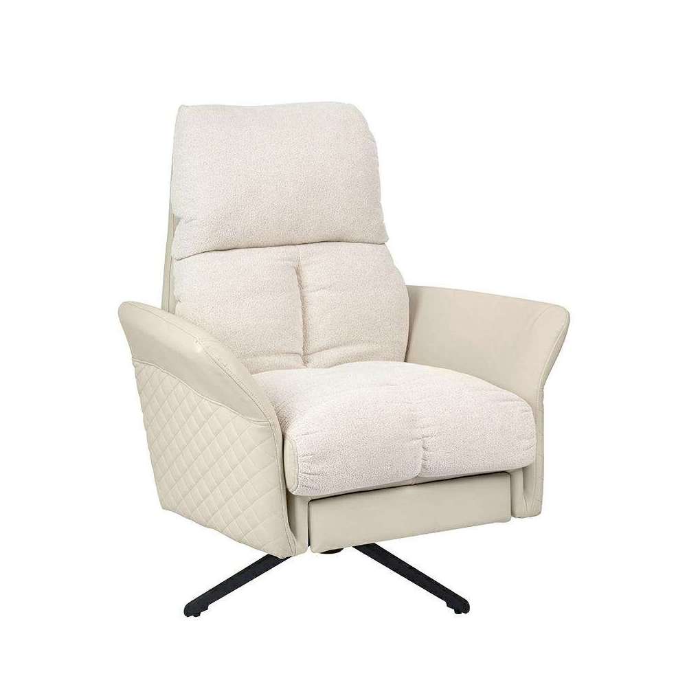Fotel obrotowy RELAX beżowy - skóra PU, stal. Ponadczasowy, przytulny fotel z najwyższym komfortem użytkowania. Korpus fotela oraz podłokietniki wykończono skórą PU w beżowym odcieniu. Pikowania na boku dodają całości elegancji oraz niesamowitego stylu. Wygodne siedzisko obszyto przyjemną oraz modną w dotyku tkaniną Teddy. Całość osadzono na stabilnej stalowej podstawie w czarnej kolorystyce. Dodatkowym atutem jest obrotowy mechanizm, rozkładane oparcie oraz możliwość wysunięcia podnóżka. To wszystko gwarantuje nam wyjątkowy relaks oraz design. Wymiary: wys. 98 cm / szer. 83 cm / gł. 80 - 170 cm Wysokość do krawędzi siedziska: 42 cm Siedzisko: szer. 50 cm / gl. 52 cm Oparcie: wys. 60 cm / szer. 50 cm Wysokość do podłokietników: 57 cm Podłokietniki: szer. 15 cm / gł. 56 cm Wysokość do podnóżka: 35 cm Podnóżek: wys. 18 cm / szer. 45 cm / gł. 37 cm Podstawa: 57 x 57 cm.