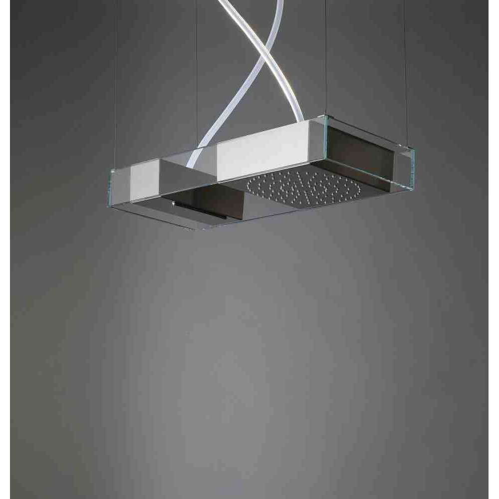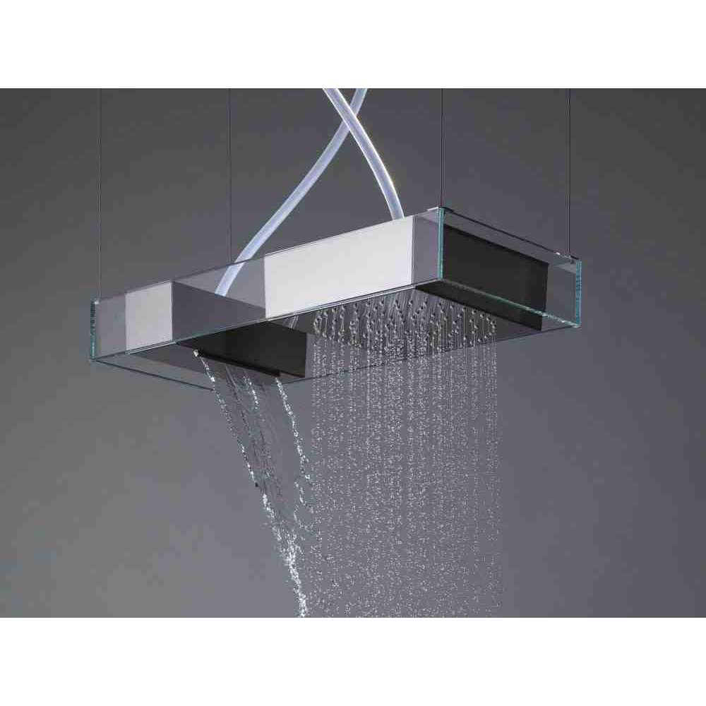 Na zdjęciu Moove – nowa inteligentna głowica prysznicowa FIMA Carlo Frattini. Wersja podsufitowa z modułami wodospadu i deszczownicy, rama ze szkła hartowanego i kabiny prysznicowe z wykończeniem ze szczotkowanej stali. Innowacyjność i design znajdują swoje największe osiągnięcie w wersji z ramą ze szkła hartowanego. Szkło to innowacyjny materiał na głowice prysznicowe, rama kształtuje niewidzialną i elegancką architekturę oraz tworzy spektakularne scenograficzne otoczenie wewnątrz prysznica.