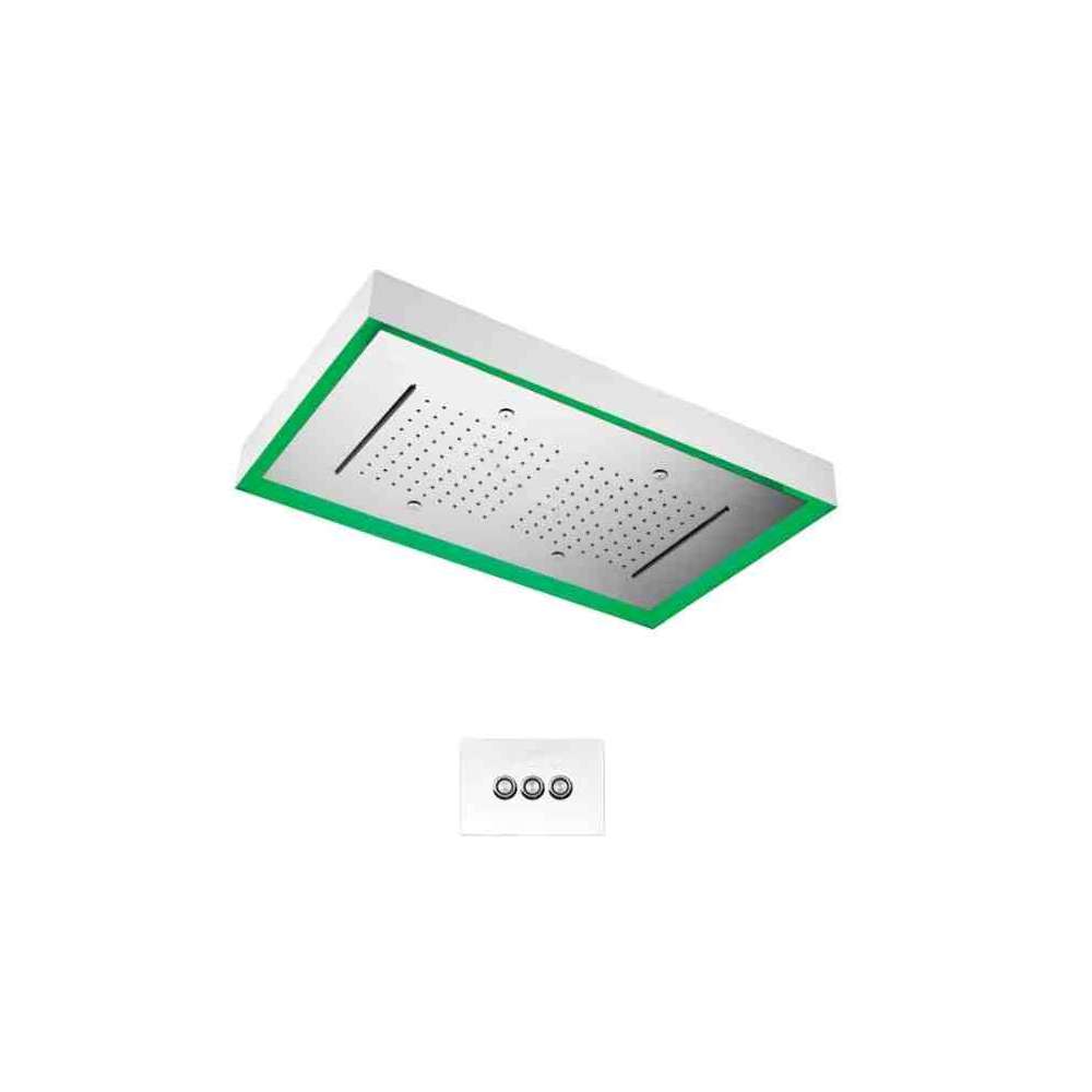 Prysznic sufitowy prostokątny PRIVE' ze stali nierdzewnej 770x470, 160 dysz, grubość 8. Funkcja chromoterapii Opaski LED RGB z 7 programami kolorystycznymi po 1 minutę każdy (Biały - Czerwony - Niebieski - Żółty - Fuksja - Jasnoniebieski) w trybie automatycznym i ręcznym. 3 dysze: normalny strumień 14 l/min, wodospad 18 l/min, nebulizowany 8 l/min. Przyłącze 1/2". W komplecie z wbudowaną częścią. Pasuje do baterii prysznicowej z przełącznikiem 3-drożnym. W zestawie pilot zdalnego sterowania z wyświetlaczem cyfrowym i transformatorem 230 12/24 V 50 VA. Marka CE.