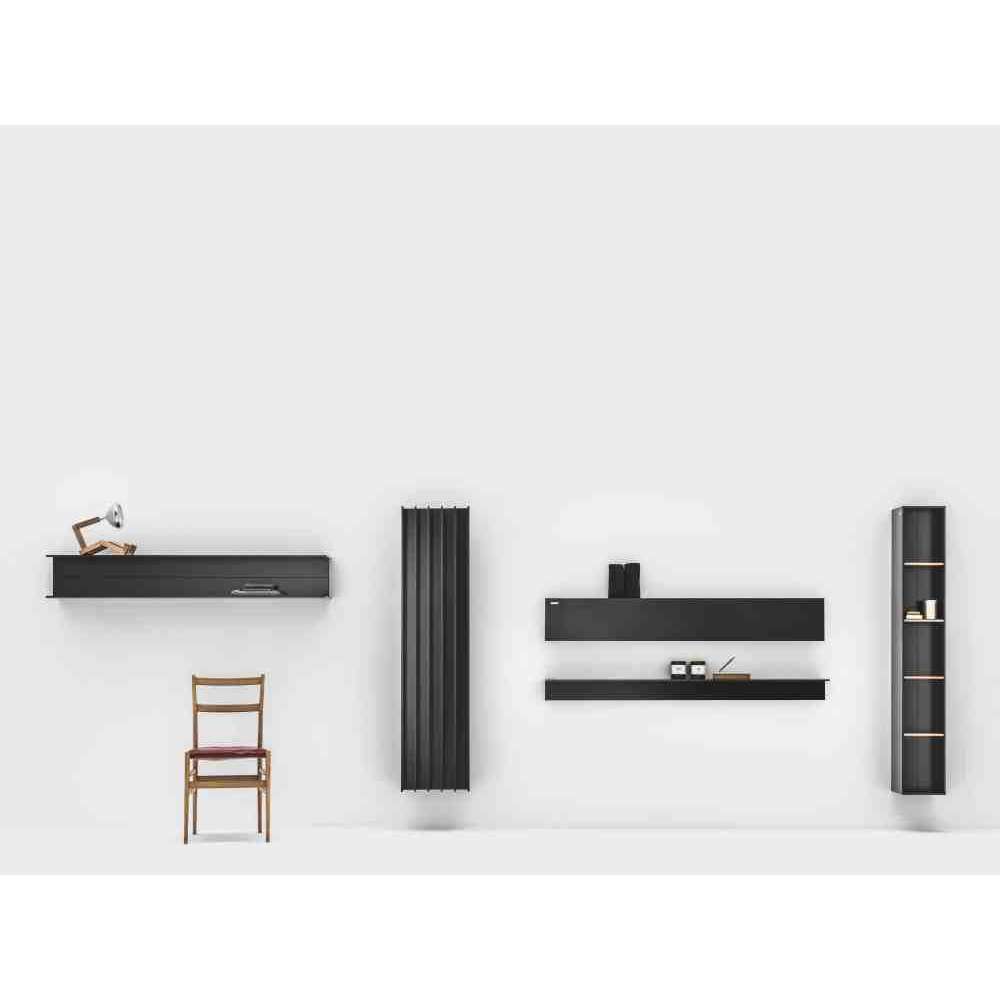 Więcej niż tylko grzejnik; mebel, który integruje się z przestrzeniami o wielkiej osobowości, ale nie chce być w centrum uwagi. Pod względem głównych cech jest to utwór podstawowy, lekki i eklektyczny. Za pomocą samego profilu aluminiowego można tworzyć „ciepłe” konfiguracje: pojedyncze i łączone półki, uchwyty na przedmioty, wieszaki na ręczniki itp. do łazienki, przedpokoju, przedpokoju, kuchni i salonu. Pierwszy dopasowany grzejnik, wykonany z ekstrudowanego aluminium, z przekrojem w kształcie litery T, od którego pochodzi jego nazwa. Jest dostępny w różnych konfiguracjach, zarówno w wersji pionowej, jak i poziomej. Oprócz standardowych rozmiarów - 150 cm i 200 cm, element można zamówić w najbardziej przydatnej dla klienta długości, od minimum 100 cm do maksimum 250 cm, z krokiem 1 cm. Pozwala to na maksymalną elastyczność i sprawia, że „T” jest produktem, który można „zszyć” w sposób dostosowany do specyficznych wymagań klienta. Dzięki temu produkt idealnie wkomponowuje się w otaczającą go przestrzeń. Sekcja aluminiowa zapewnia również doskonałą moc grzewczą przy bardzo małej zawartości wody, spełniając stale rosnące potrzeby domów o wysokiej sprawności cieplnej. Specyficzna struktura produktu sprawia, że doskonale sprawdza się nie tylko w warunkach dziennych, ale także jest użytecznym i wydajnym grzejnikiem do łazienek i pomieszczeń wypoczynkowych, gdzie może służyć jako podgrzewany wieszak na ręczniki i wieszak na szlafrok lub do przechowywania ręczników.