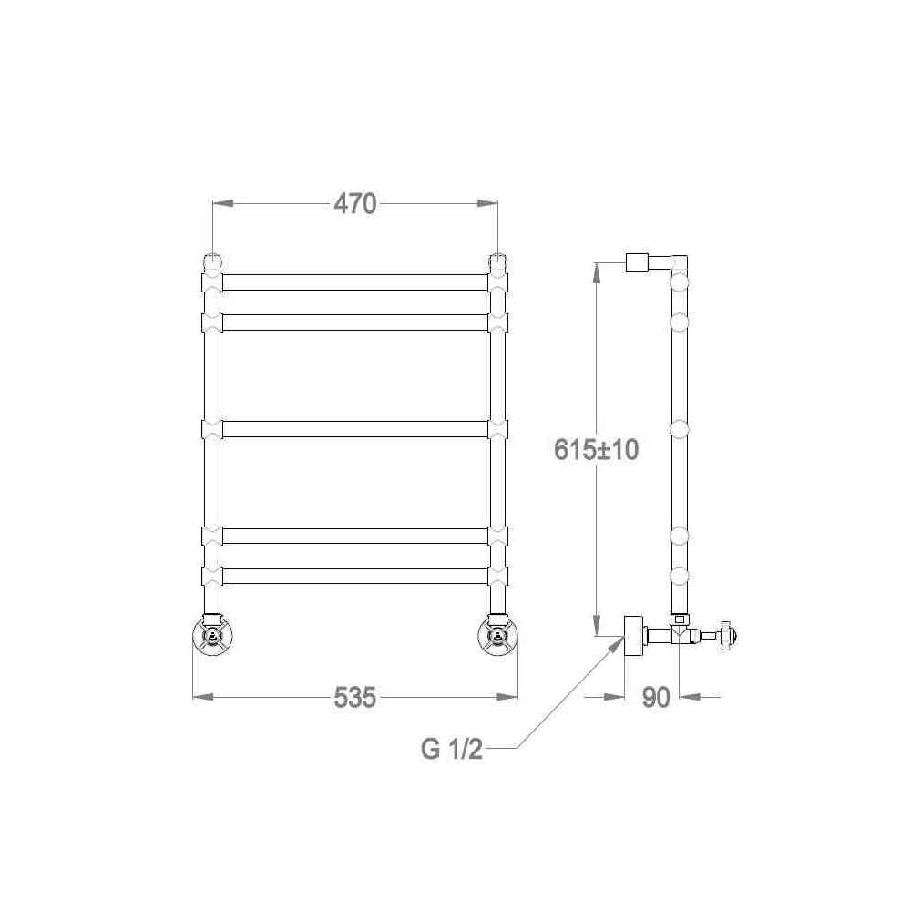 Poręcz wodna mocowana na ręczniki, wysokość 615 mm, odległość między środkami 470 mm.