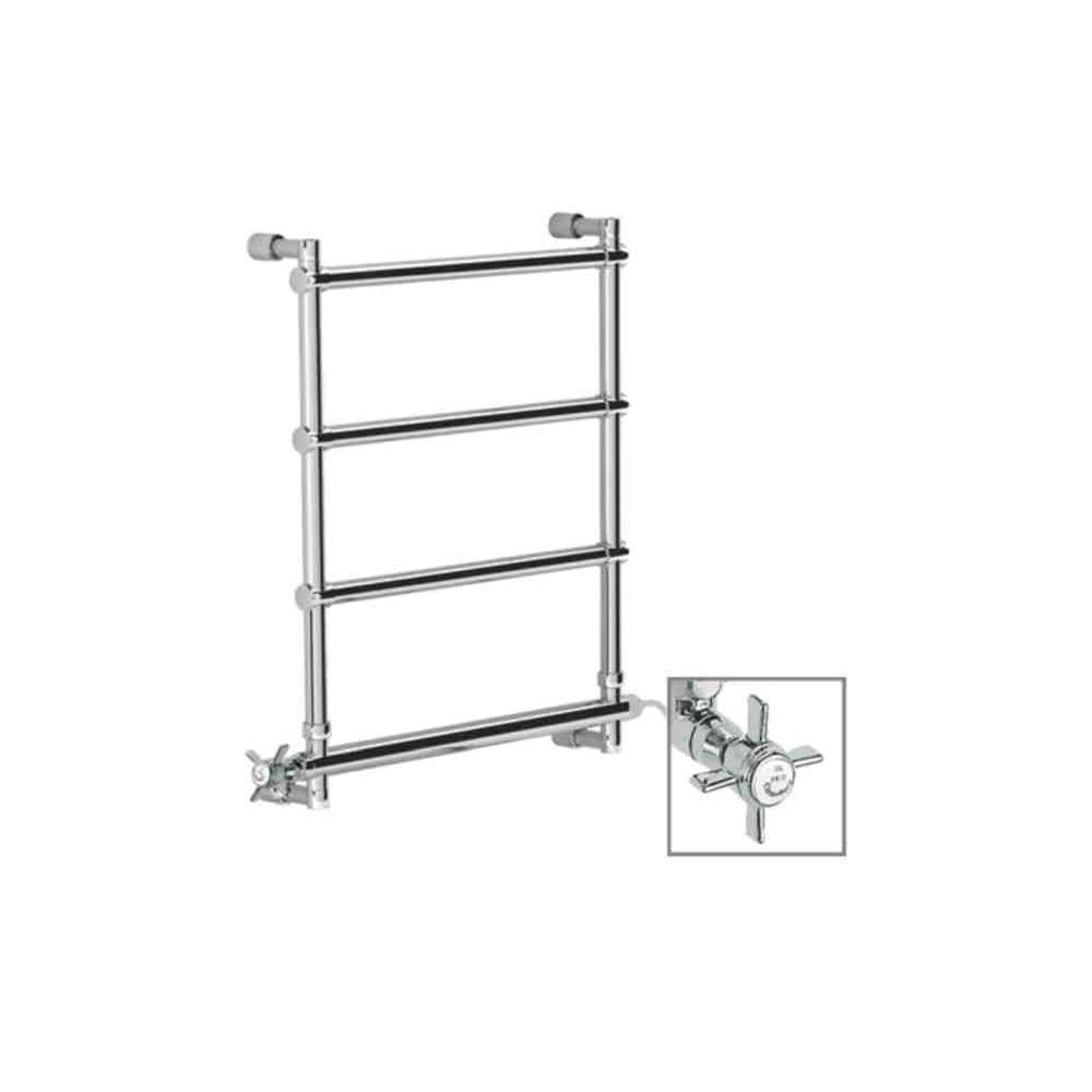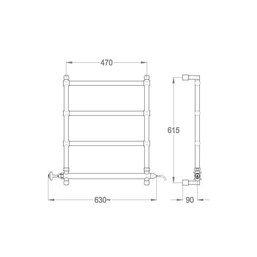 Elektryczny stały podgrzewacz do ręczników, wysokość 615 mm, odległość między środkami 470 mm.