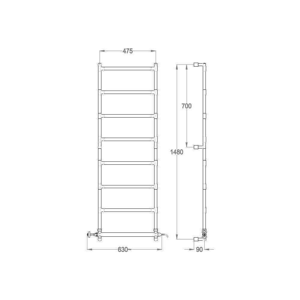 Elektryczny stały podgrzewacz do ręczników, wysokość 1480 mm, odległość między środkami 475 mm.