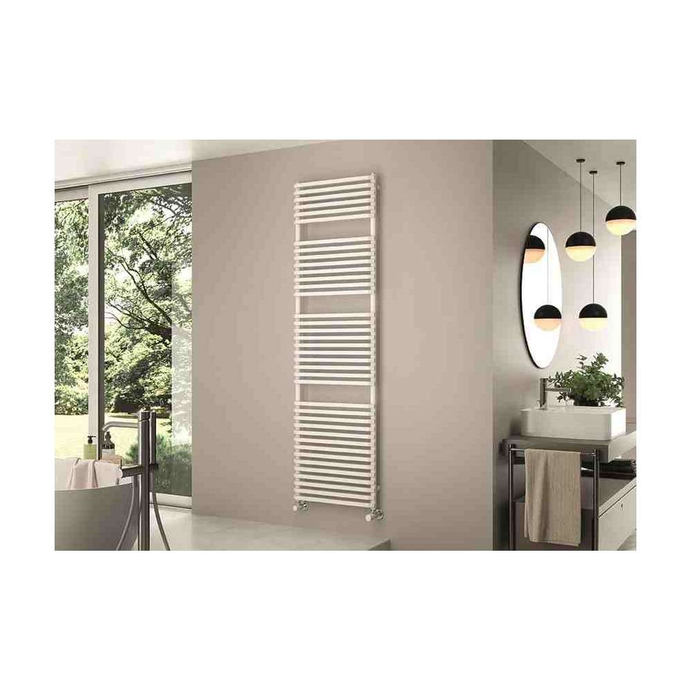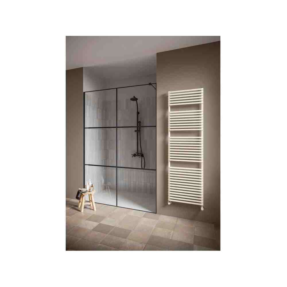 Prostokątny profil poziomych rurek grzejnika NET przecina się z kołem kolektora, nadając grzejnikowi specjalną linię i proporcję. Jego geometria wpasowuje się w przestrzeń łazienki, nadając wnętrzu osobowość.