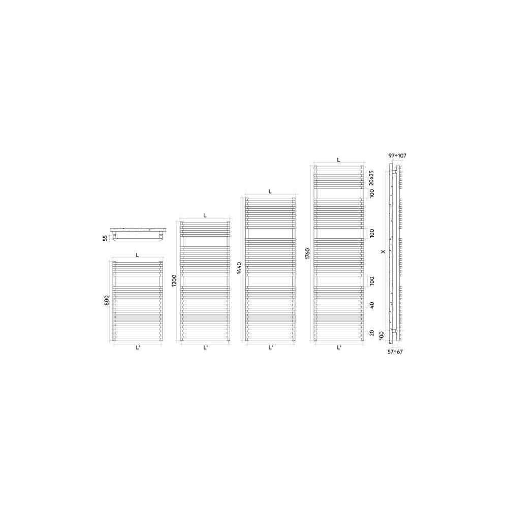stalowy grzejnik do ręczników z elementami poziomymi o prostokątnych rurkach o przekroju 20x25 mm; kolektory boczne okrągłe o średnicy 30 mm; gwintowanie kolektora 1/2” Gaz prawy; maksymalne ciśnienie robocze 4 bary; maksymalna temperatura pracy 95°C.