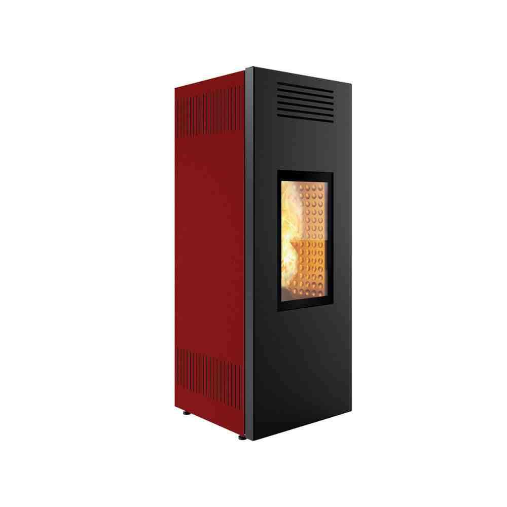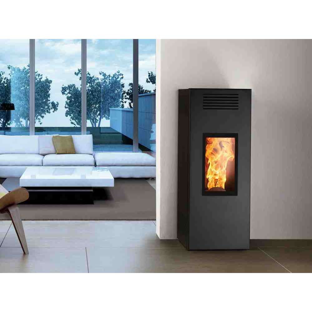 Minimalistyczny design tego pieca, z dużymi przednimi drzwiami, które podkreślają jego geometryczną formę, naznaczoną kompaktowymi i kwadratowymi profilami. Okładzina z malowanej blachy stalowej. Konstrukcja ze stali malowanej na czarno.