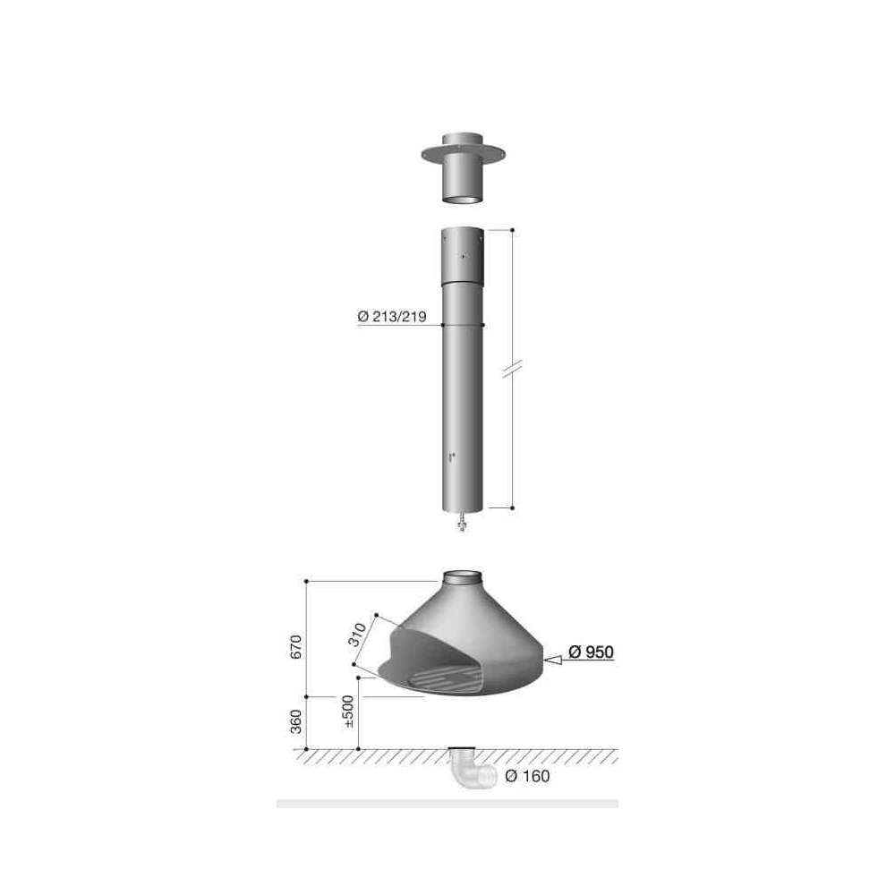 palenisko: średnica 0,95 m, waga 63 kg; standardowa waga talerzy: 19 kg; przewód kominowy: 16 kg/m, (na wymiar); matowa czarna farba o wysokiej odporności na wysoką temperaturę; zapadnia do usuwania popiołu. System łożysk kulkowych ze stali nierdzewnej umożliwia obracanie kominka, dzięki czemu można go łatwo skierować w różne części pomieszczenia. - gwarantowana wydajność przy minimalnej długości komina (wewnątrz i na zewnątrz) 3,25 m.
