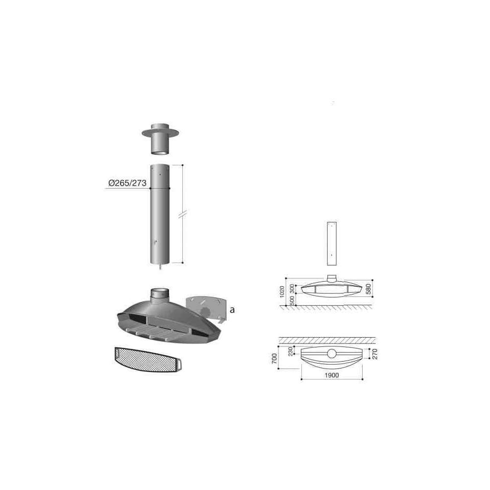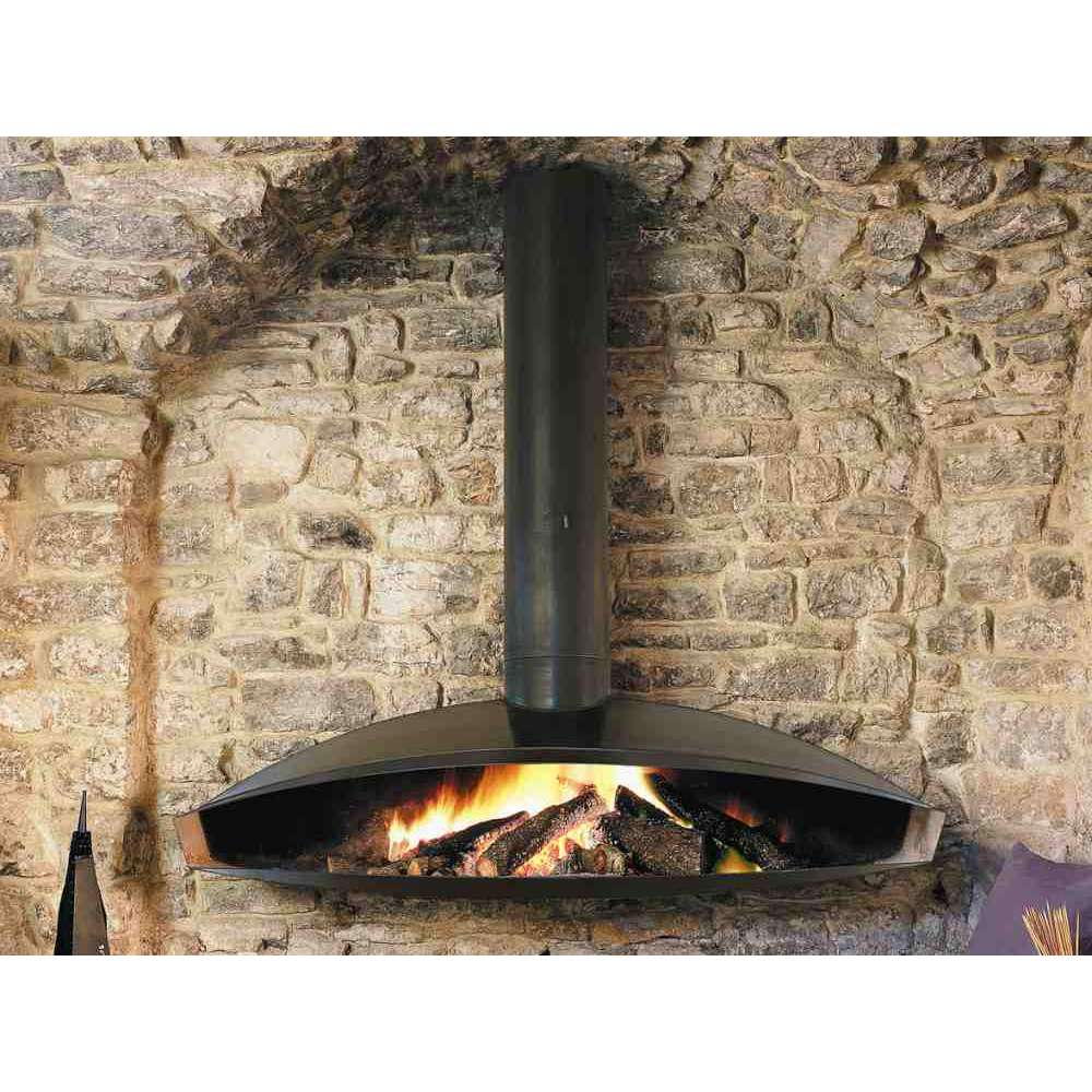 Model podwieszany lub naścienny z możliwością regulacji kierunku; możliwość ustawienia przy ścianie lub na środku pomieszczenia kominek: 125 kg, stal surowa polerowana z widocznymi szwami spawalniczymi; przewód kominowy: średnica 273 mm, 27 kg/m. Kominek posiada szeroki otwór (1,90 m) mogący pomieścić wyjątkowo długie polana. - gwarantowana wydajność przy minimalnej długości przewodu kominowego (wewnątrz i na zewnątrz) 4,5 m. -