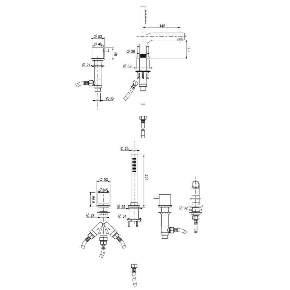 Ta bateria wannowa montowana na blacie zawiera: wylewkę wannową montowaną na blacie z dwoma zaworami odcinającymi (ciepło-zimno) z przełącznikiem oraz słuchawkę prysznicową z plecionym wężem ze stali nierdzewnej.
