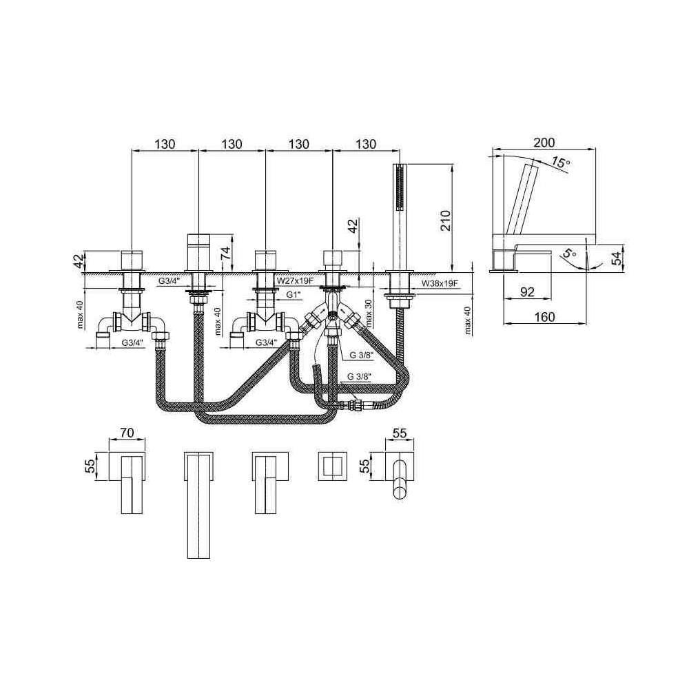 Fantini Rubinetti, angelettiruzza design, AR/38, krany wannowe, krany łazienkowe, krany wannowe, nowoczesne krany wannowe, Design krany wannowe, metalowe krany wannowe, mosiężne krany wannowe, chromowany mosiądz krany wannowe, 5-otworowe krany wannowe, krany wannowe ręcznie prysznic, zestaw wannowy, baterie wannowe z przełącznikiem