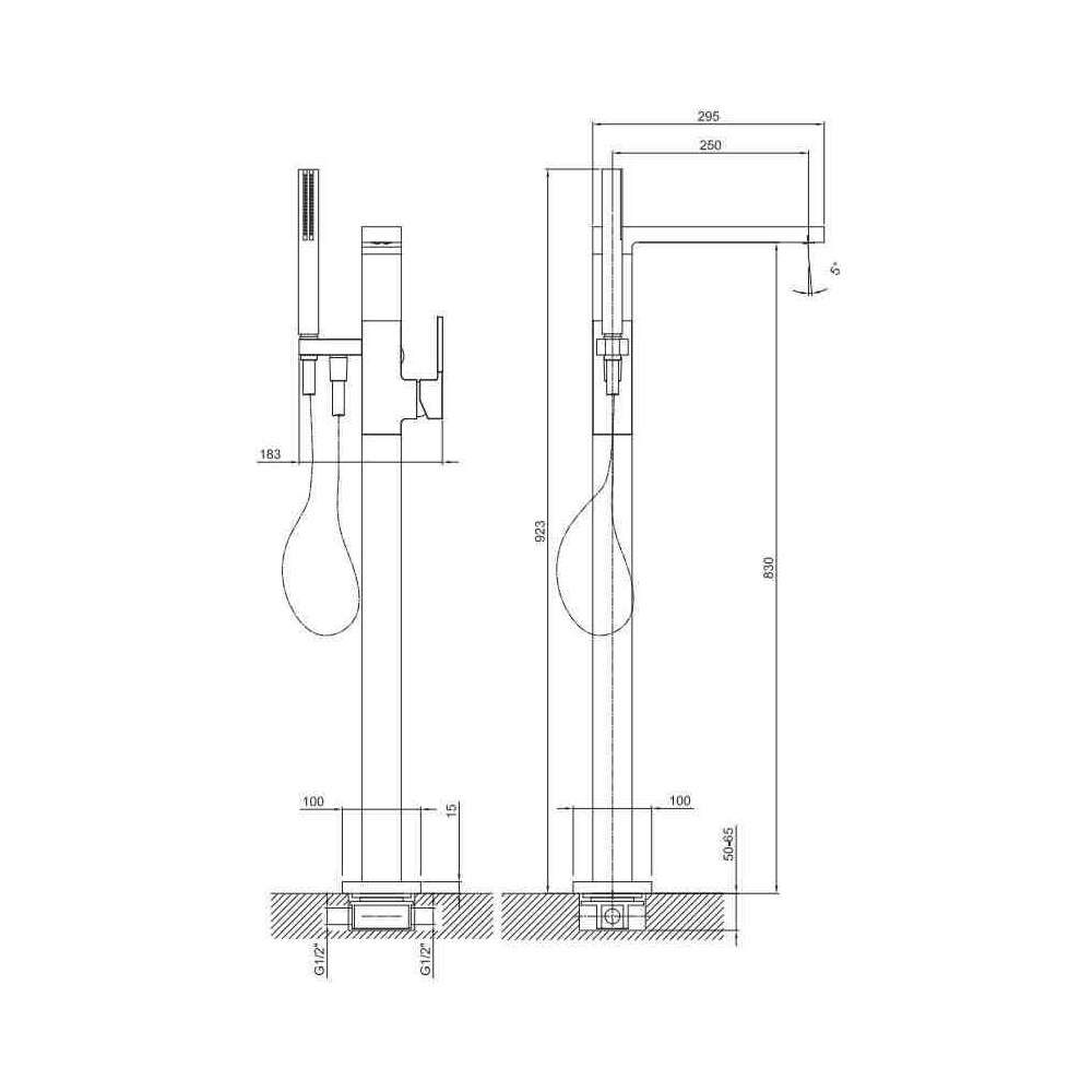 Bateria wannowa jednouchwytowa mocowana na stojące przyłącza podłogowe, z prysznicem ręcznym SUN, ze wspornikiem i elastycznym PVC – uchwyt.