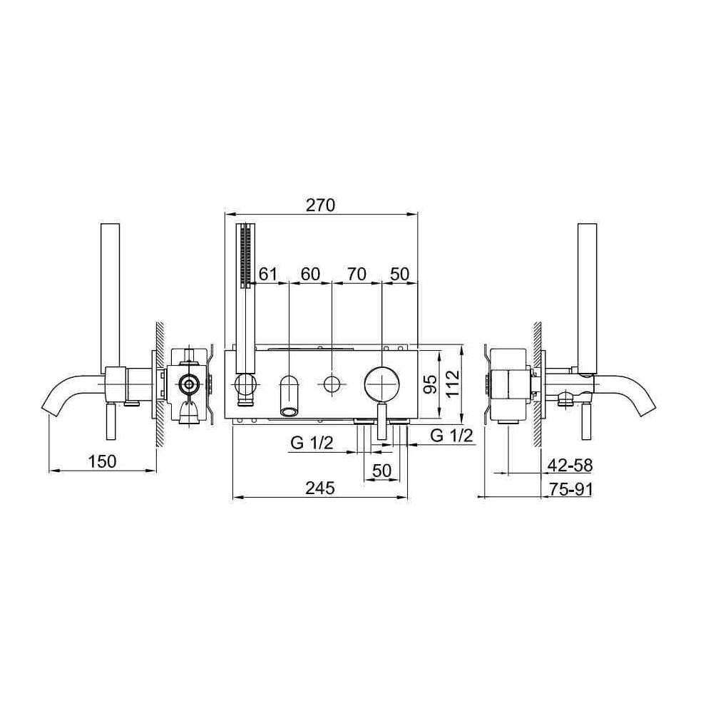 Wbudowana bateria wannowa z wylewką 15 cm, prysznicem ręcznym SUN, wspornikiem, elastycznym wężem PVC i przełącznikiem z uchwytem.