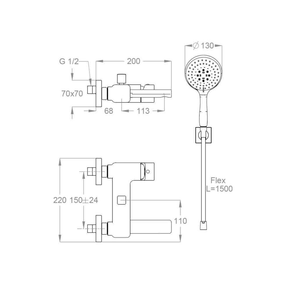 Bateria wannowa ścienna mosiężna z główką prysznicową Fir Italia Daily Cube 45 - 4534016