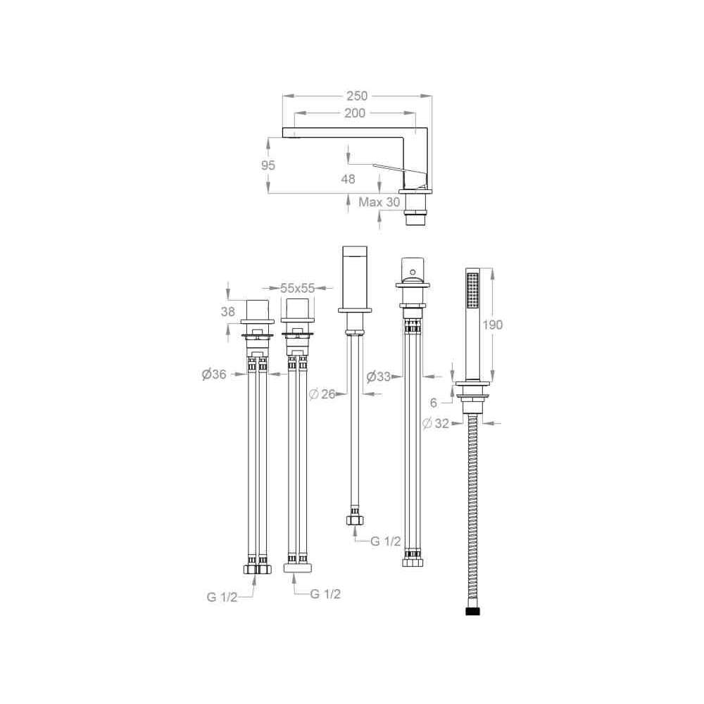 Bateria wannowa mosiężna podtynkowa 5-otworowa z główką prysznicową Fir Italia Doda 67 - 6731404