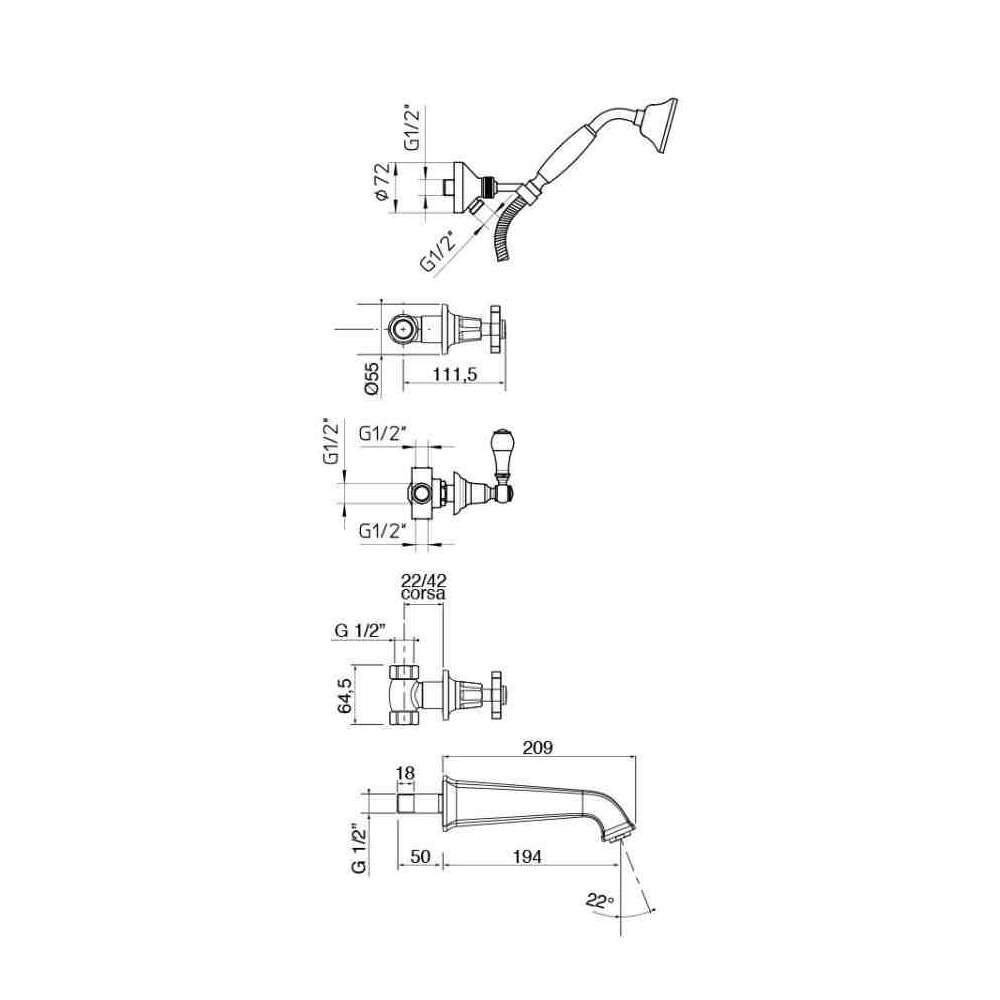 Zestaw wannowy ścienny 5-otworowy z główką prysznicową Gentry Home Chopin Metal