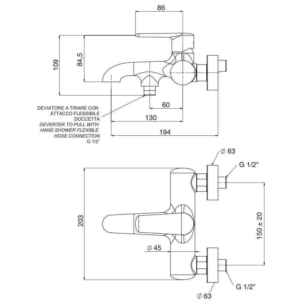 2-otworowa, ścienna, jednouchwytowa bateria wannowa ABS Rubinetterie Mariani Armonia