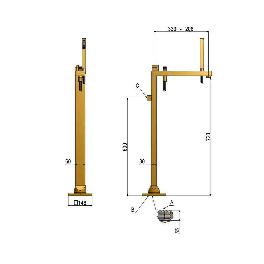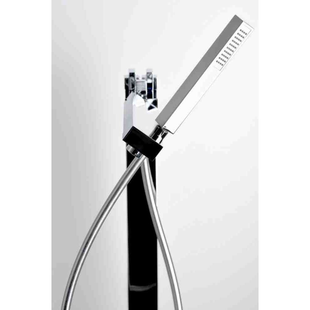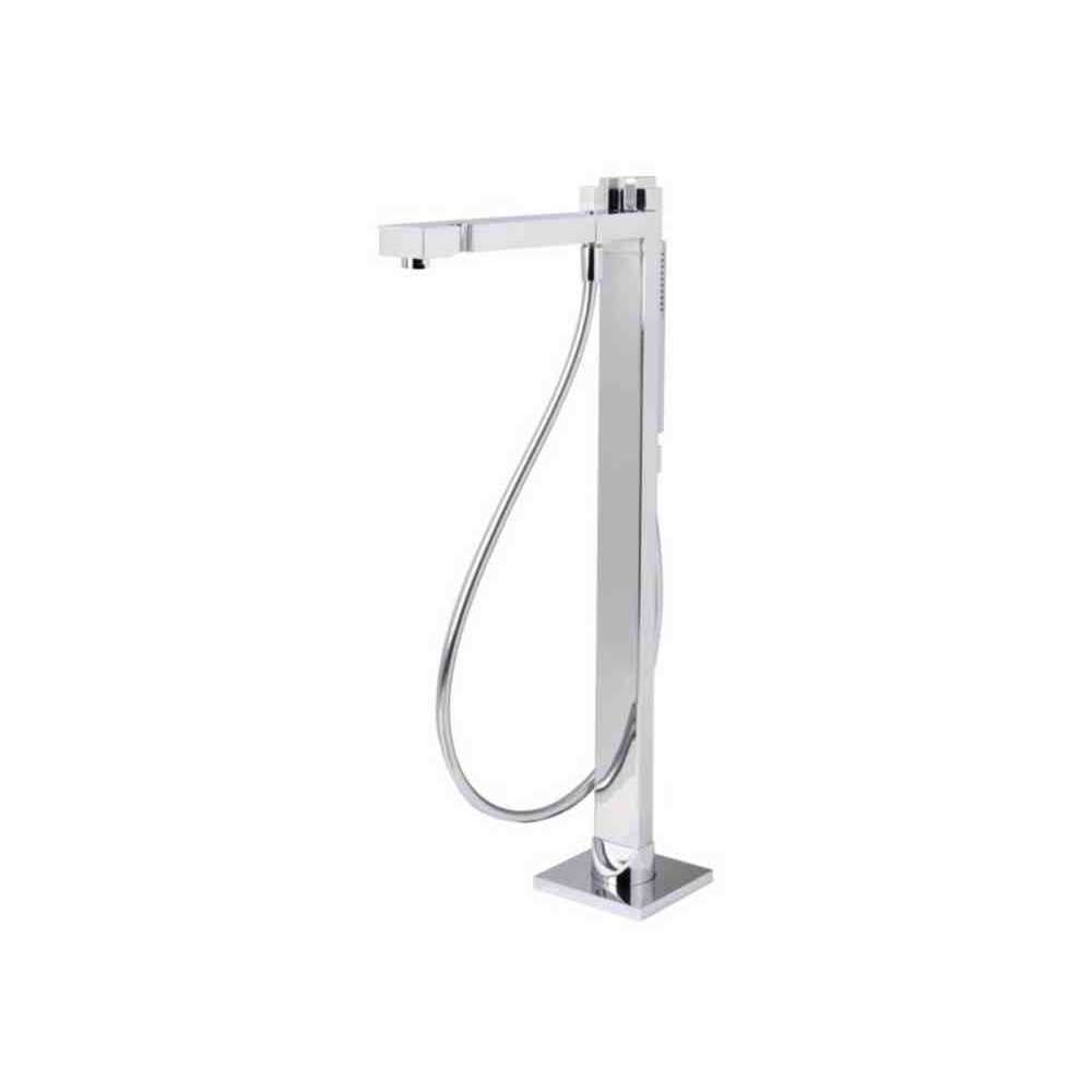 Wolnostojąca bateria wannowa o przekroju prostokątnym z odpływem ciepłej/zimnej wody i prysznicem ręcznym.