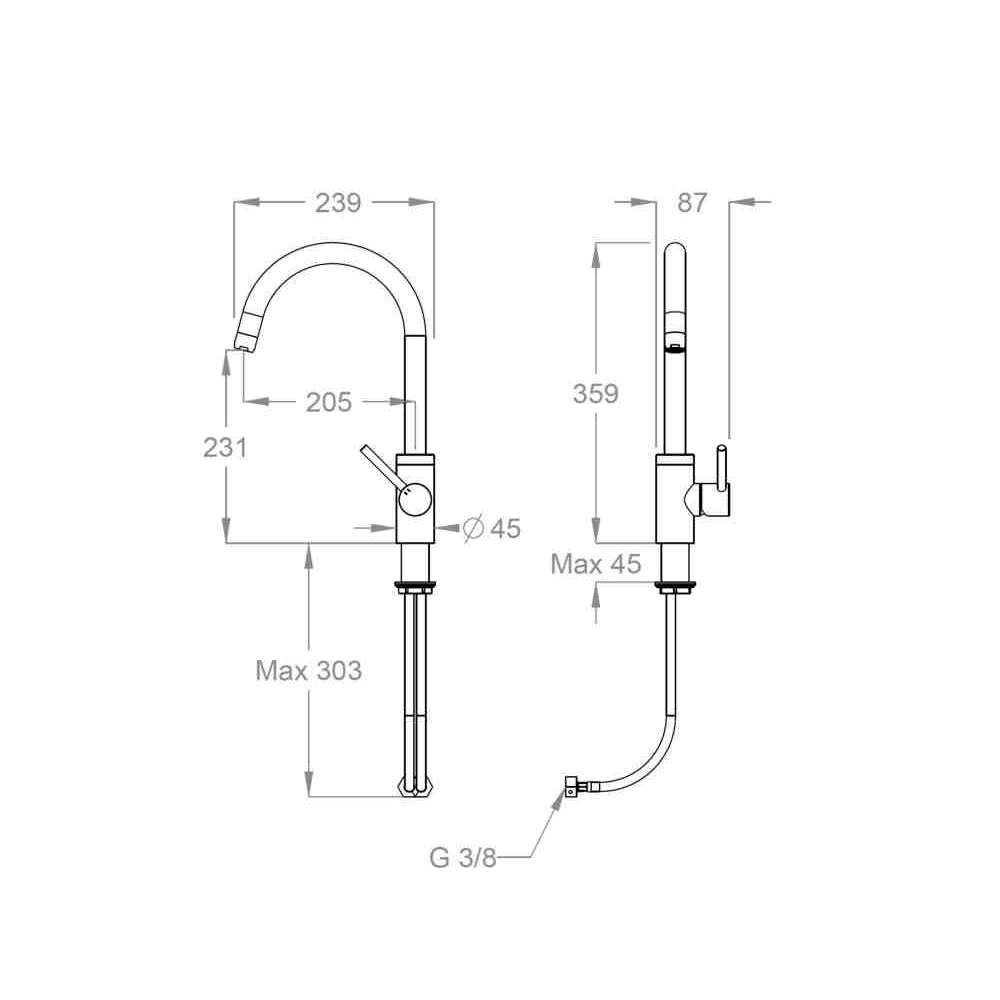 Jednouchwytowa bateria zlewozmywakowa z obrotową wylewką, wysokość 359 mm, odległość od środka 205 mm.
