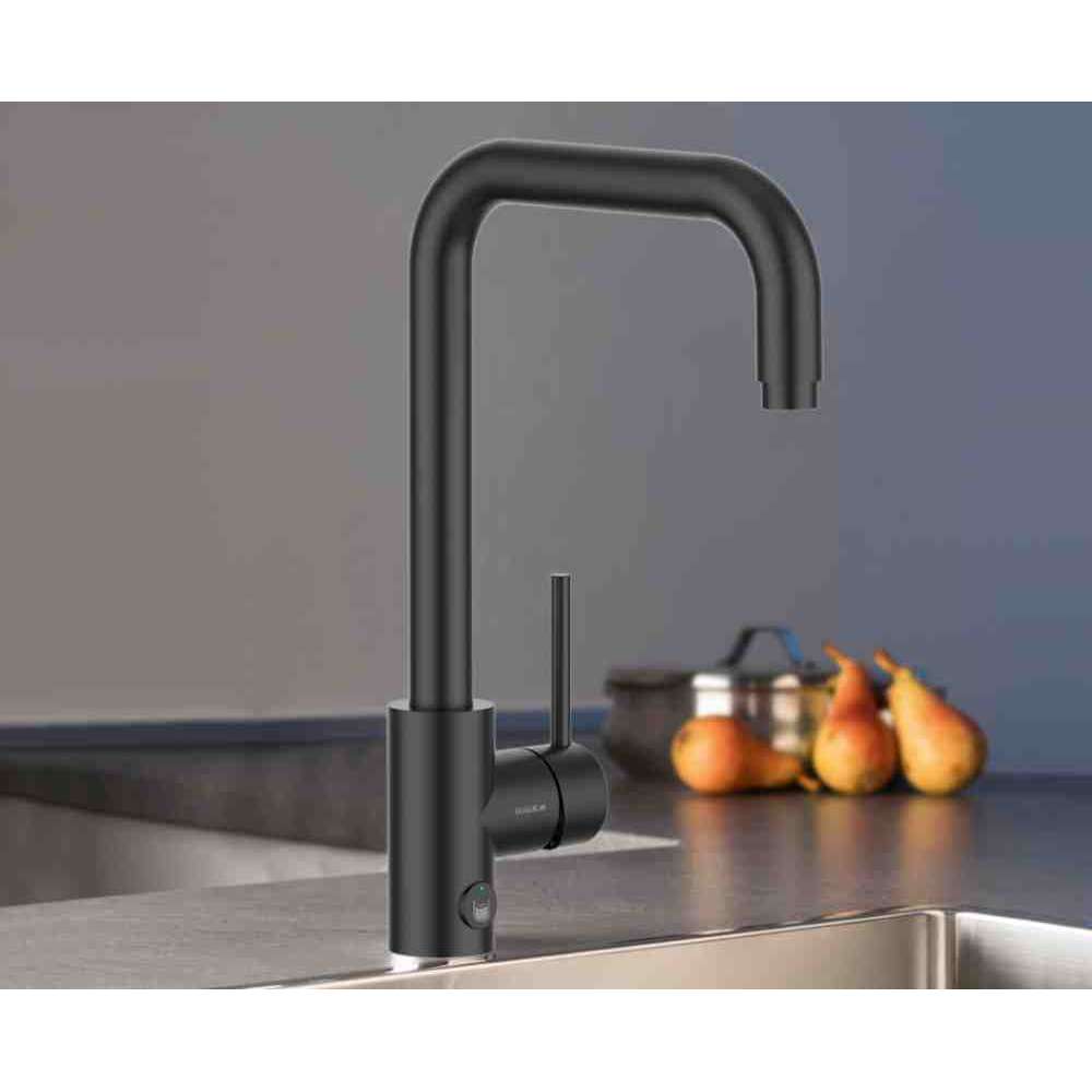 Bateria zlewozmywakowa jednouchwytowa, obrotowa wylewka, perlator 22x1, wkład ceramiczny do wody użytkowej o przepływie 12 l/min. Przycisk dotykowy na wodę niegazowaną z automatyczną blokadą, przepływ 5 l/min, w komplecie z elektronicznym zespołem i wodoodpornym pojemnikiem na baterię 9V w komplecie z technologią Guglielmi. Elektronika z oznaczeniem CE. Węże elastyczne 3/8" przyłączeniowe z softpexu, wspornik montażowy za pomocą 3 śrub, rura spożywcza LLDPE z szybkozłączem, zawór odcinający. W komplecie z systemem mikrofiltracji z 2 śrubami do montażu na ścianie.