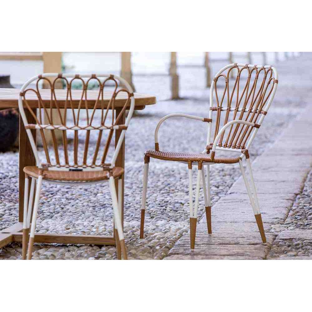 Fiorella to krzesło do jadalni, rama aluminiowa malowana proszkowo farbą epoksydową, syntetyczna trzcina i splot.