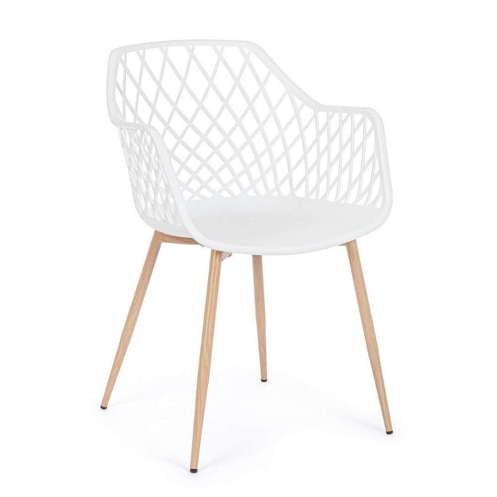 BIZZOTTO krzesło OPTIK białe. Krzesło OPTIK to połączenie nowoczesnego designu z subtelnym nawiązaniem do klasyki. Siedzisko wykonane z trwałego polipropylenu jest odporne na uszkodzenia i doskonale sprawdza się w codziennym użytkowaniu. Stabilna, metalowa podstawa z wykończeniem imitującym drewno nie tylko zapewnia trwałość, ale także wprowadza naturalny akcent do wnętrza. Ażurowe oparcie, inspirowane formą plecionki, dodaje lekkości całej konstrukcji i podnosi komfort siedzenia. Biel siedziska w zestawieniu z jasnymi, drewnopodobnymi nogami podkreśla prostotę i uniwersalny charakter projektu. Model idealnie odnajduje się zarówno w kuchni i jadalni, jak i w przestrzeniach komercyjnych czy biurowych. Dostępny w różnych wersjach kolorystycznych, znajdź idealny wariant dla swojego wnętrza. Wymiary: wys. 85,5 cm / szer. 58 cm / gł. 54 cm Waga brutto: 5,31 kg.
