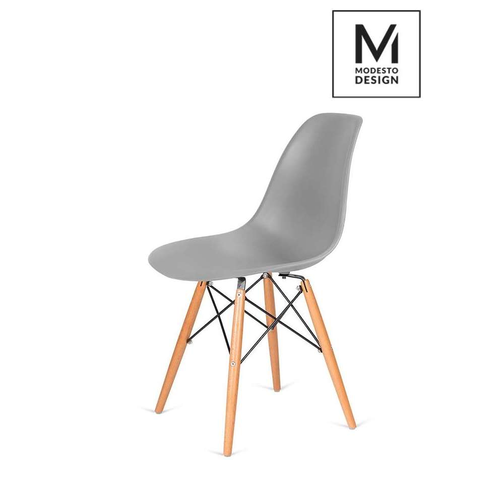 MODESTO krzesło DSW szare - podstawa bukowa. Połączenie nowoczesnej formy z klasycznym urokiem. Siedzisko oraz oparcie wykonano z wysokiej jakości tworzywa, które cechuje się trwałością, estetycznym wyglądem i łatwością w utrzymaniu czystości. Podstawa z litego drewna bukowego wprowadza do wnętrza naturalne ciepło i ponadczasowy wdzięk. Stalowe łączenia w czarnym kolorze dodają całości nowoczesnego akcentu oraz gwarantują stabilność i wytrzymałość. Szary kolor wprowadza do wnętrza spokój, równowagę i subtelną elegancję. To znakomity wybór do jadalni, salonu, biura czy kawiarni, wszędzie tam, gdzie ważny jest komfort, trwałość i styl. Wytrzymałe wykonanie zapewnia bezpieczeństwo i komfort użytkowania do 130 kg. Świetnie komponuje się z wnętrzami nowoczesnymi, skandynawskimi oraz industrialnymi, dodając harmonii i wyrafinowanego charakteru. Wymiary: wys. 82 cm / szer. 46 cm / gł. 48 cm Waga netto: 3.50 kg Wymiary opakowania: 58 cm / 56 cm / 52 cm.