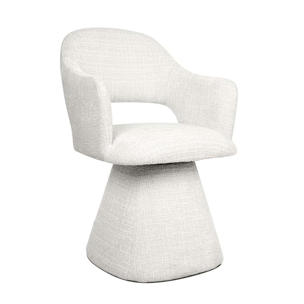 MaMaison krzesło obrotowe VERONA białe. Propozycja dla osób ceniących elegancję, nowoczesny styl i wygodę w jednym. Subtelna forma z lekko zaokrąglonymi podłokietnikami i wycięciem w oparciu tworzy harmonijną i lekką sylwetkę. Całość tapicerowano miękką tkaniną szenilową Davis Cremona 1 w białym kolorze, która dodaje wnętrzu przytulności i elegancji. Podstawa o geometrycznym kształcie ukrywa praktyczną funkcję obrotu z automatycznym powrotem do pozycji wyjściowej, zwiększając komfort użytkowania na co dzień. Verona świetnie odnajdzie się zarówno przy stole w jadalni, jak i w eleganckim lobby czy domowym biurze. To krzesło, które łączy styl i funkcjonalność. Wymiary: wys. 88 cm / szer. 61 cm / gł. 58 cm Wysokość do krawędzi siedziska: 49 cm Wysokość do podłokietników: 69 cm Siedzisko: szer. 50 cm / gł. 50 cm Oparcie: wys. 48 cm / szer. 32 cm Podstawa: 42 x 42 cm Waga brutto: 10,6 kg Wymiary opakowania: 66 cm / 61 cm / 51 cm.