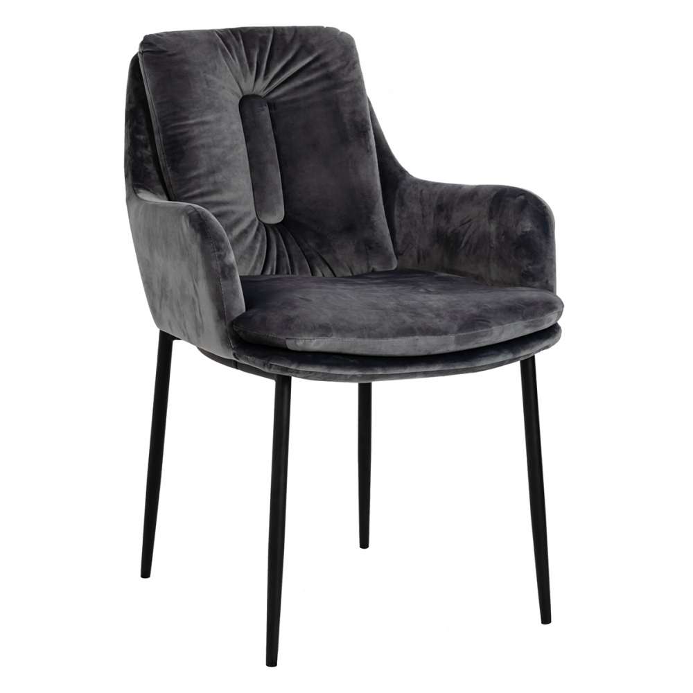 Grant krzesło w ciemnym kolorze szarym. Siedzisko i oparcie tapicerowane miękkie i przyjemne w dotyku weluru. Struktura metalowa w kolorze czarnym satynowe wykończenie. Ciekawym elementem dekoracyjnym jest złoty koniec oparcia konstrukcji. Podkreśla komfort miękki fotel w harmonii z ozdobnymi poduszkami na plecach. Krzesło doskonale odnaleźć w jadalni, salonu i biura mieszka. Wysokość tyłu: 43 cm Głębokość siedziska: 44 cm Waga netto 1 szt. 7,8 kg. Waga z opakowaniem: 16,3 kg. Opakowaniowe o wymiarach 78 cm x 59 cm x 66 cm. Maksymalna liczba elementów. Pojemnik: Sposób wysyłki 2: Pakiet Kombinacja produkt: Brak