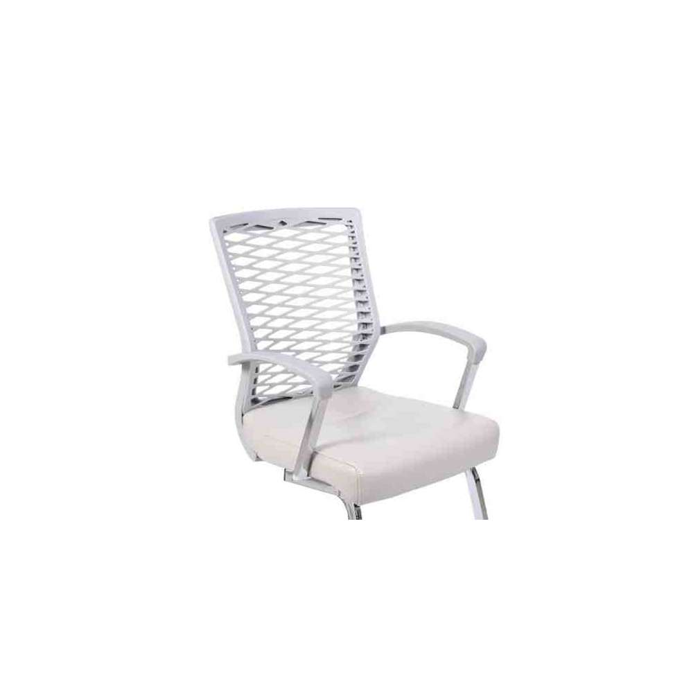 Active to ergonomiczne krzesło biurowe z siedziskiem z ekoskóry w kolorze białym, czerwonym i czarnym, oparciem z przewiewnej siatki i chromowanej metalowej podstawie.