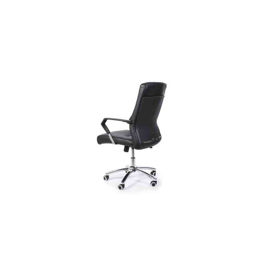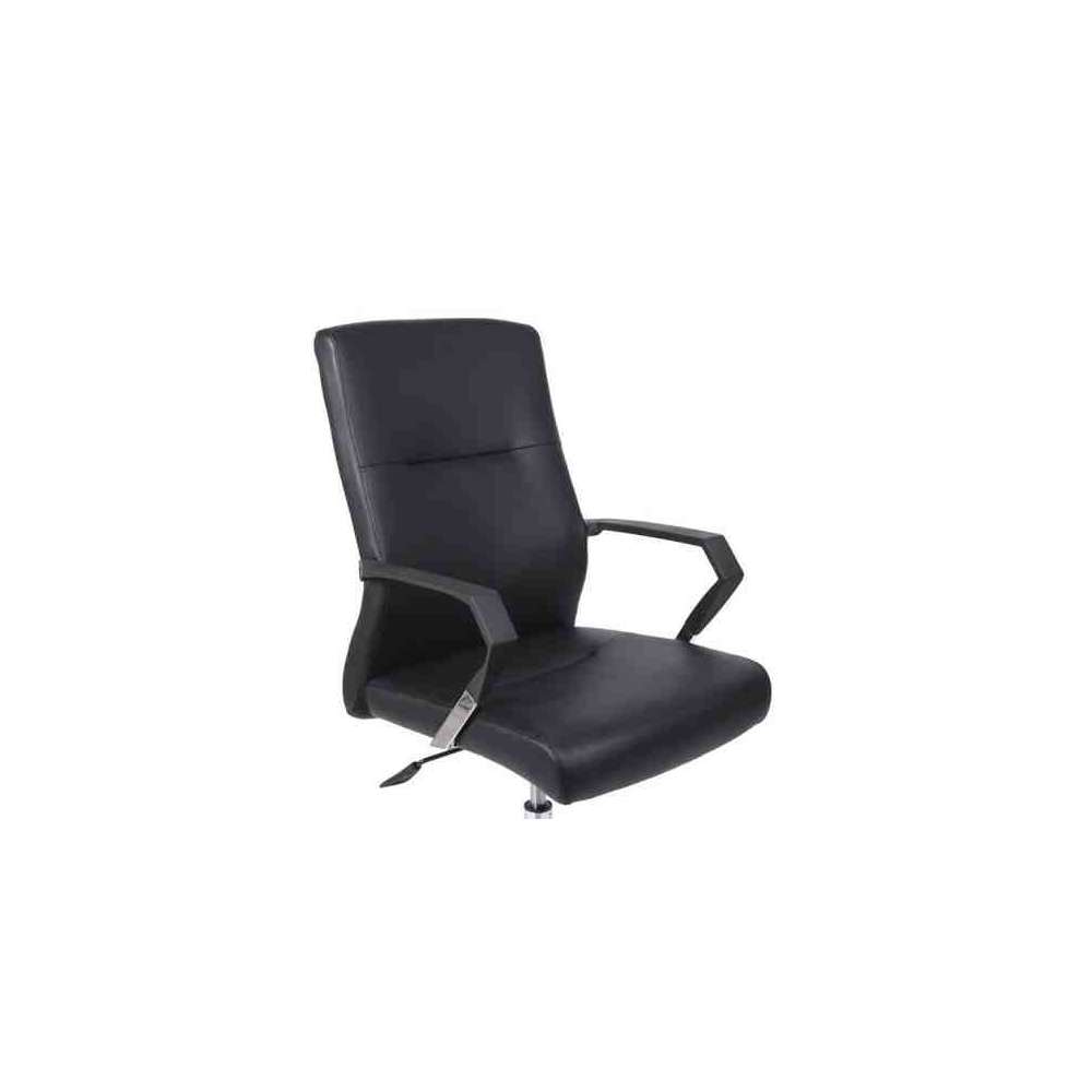 Alfa to fotel biurowy z ekoskóry w kolorach szarym, czarnym, brązowym, beżowym i zielonym. Konstrukcja z chromowanego metalu. Fotel posiada regulowaną wysokość siedziska oraz funkcję bujania z blokadą.