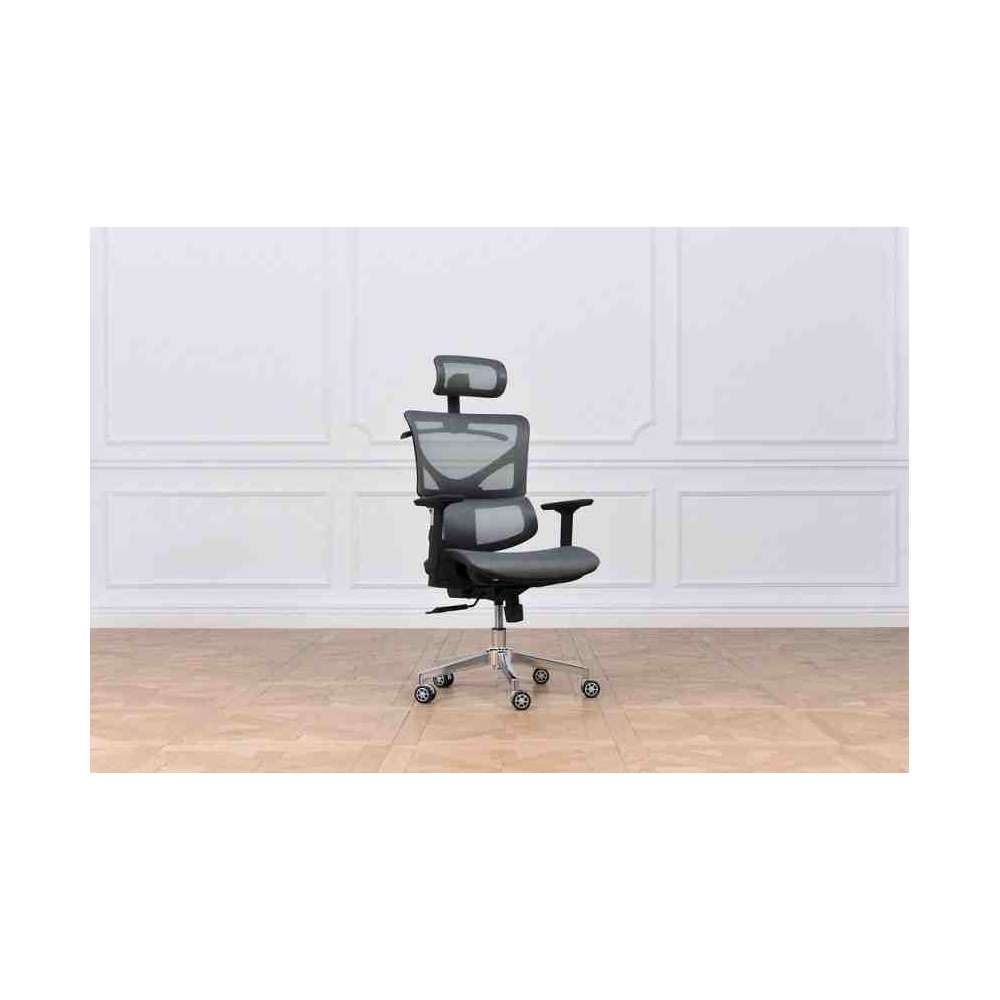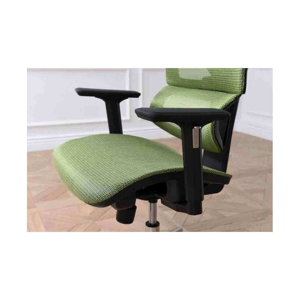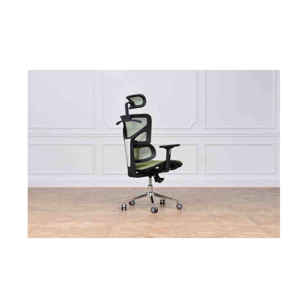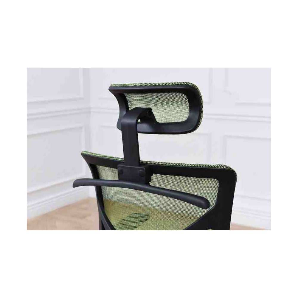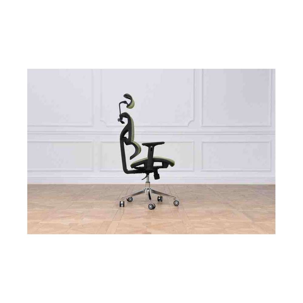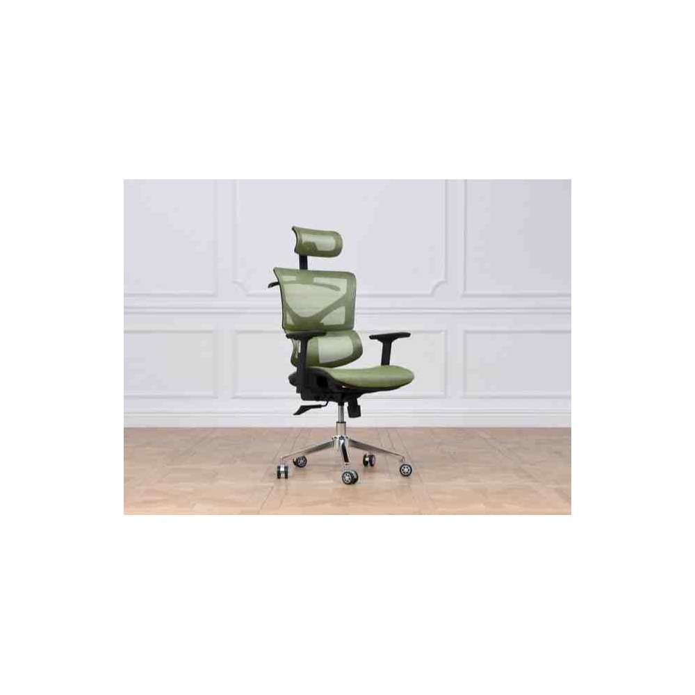 Ergo 400 to ergonomiczne krzesło biurowe z przewiewnej siatki w kolorach zielonym i szarym, z podłokietnikami z PVC i pięcioramienną podstawą z chromowanego metalu. Fotel wyposażony jest w zagłówek, podłokietniki, regulowaną wysokość siedziska i oparcia, regulację pochylenia oparcia i zagłówka, funkcję blokady bujania.
