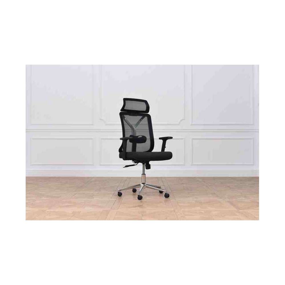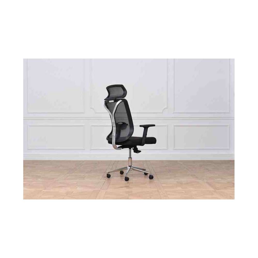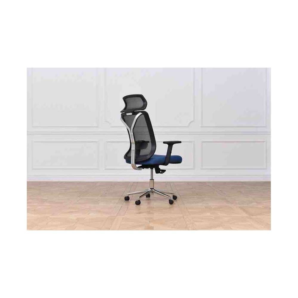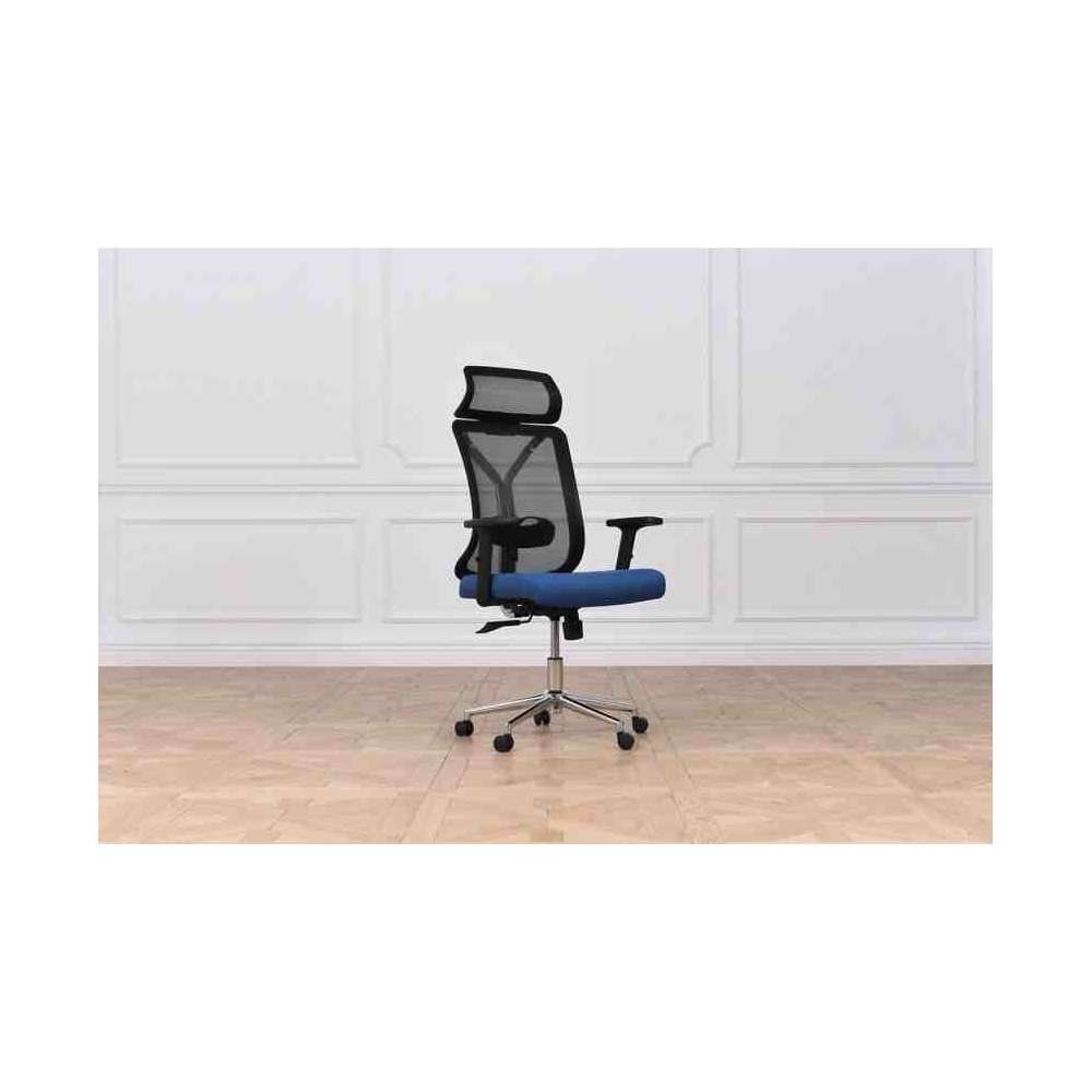 Flow to ergonomiczne, wyściełane krzesło biurowe, wykonane z wysokiej jakości tkaniny odpornej na plamy i wodę, z oddychającą siateczką w kolorze grafitowym, czarnym, niebieskim i zielonym. Konstrukcja oparcia i pięcioramienna podstawa z chromowanego metalu. Krzesło wyposażone w podłokietniki PCV z regulacją pochylenia i wysokości, zagłówek i oparcie z regulacją pochylenia, siedzisko z regulacją wysokości. Zamykana funkcja swing.